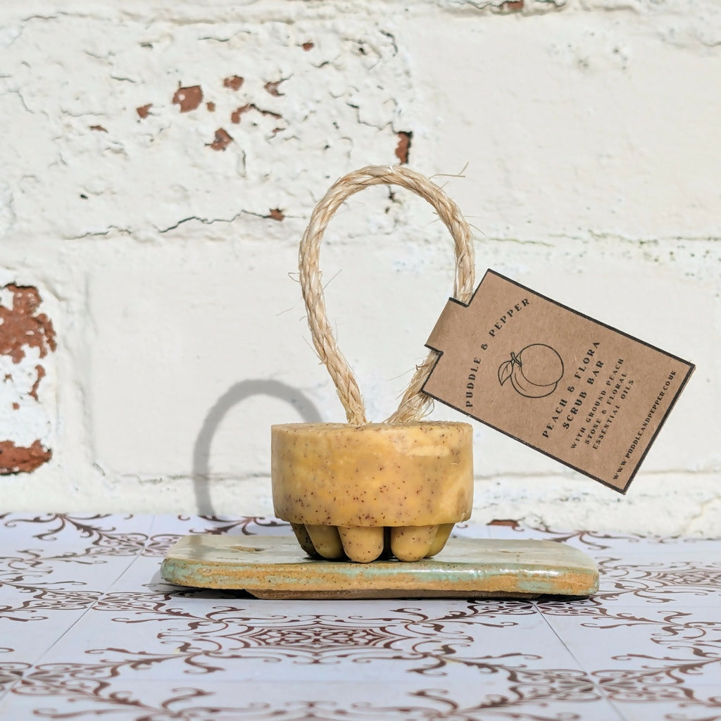 Peach & Flora is a carefully balanced scrub bar designed to smooth and refresh the skin without stripping it. Finely ground peach stone provides natural, biodegradable exfoliation — polishing away dry, dull skin while remaining gentle enough for regular use.