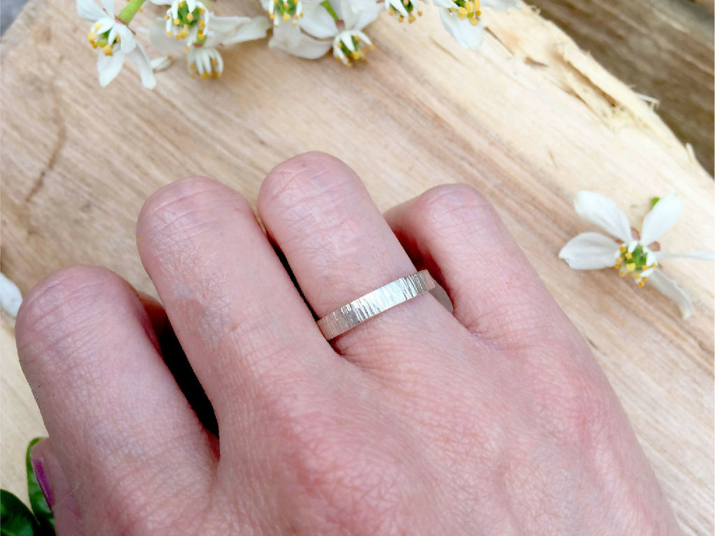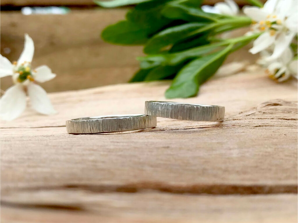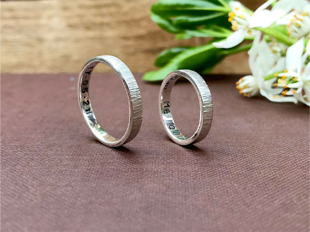 The Personalised Tree Bark Ring is handcrafted from 925 Sterling Silver and features a rustic tree bark texture on the exterior. The interior of the ring can be personalised with up to 30 characters of your choice, making it perfect for a special date, names, wedding vows, or a meaningful message.