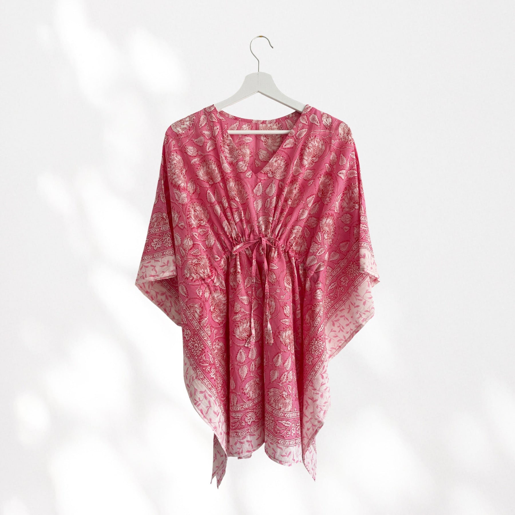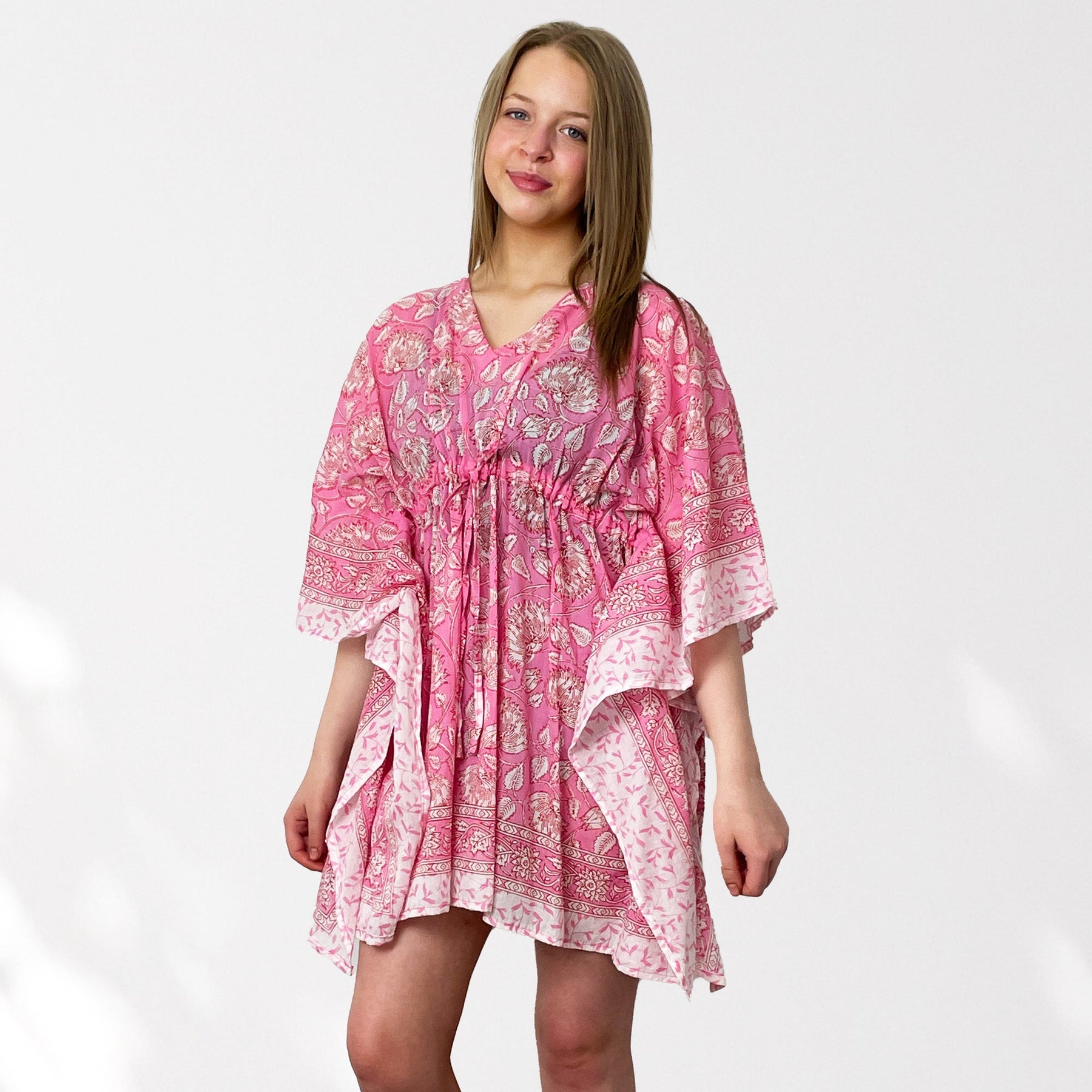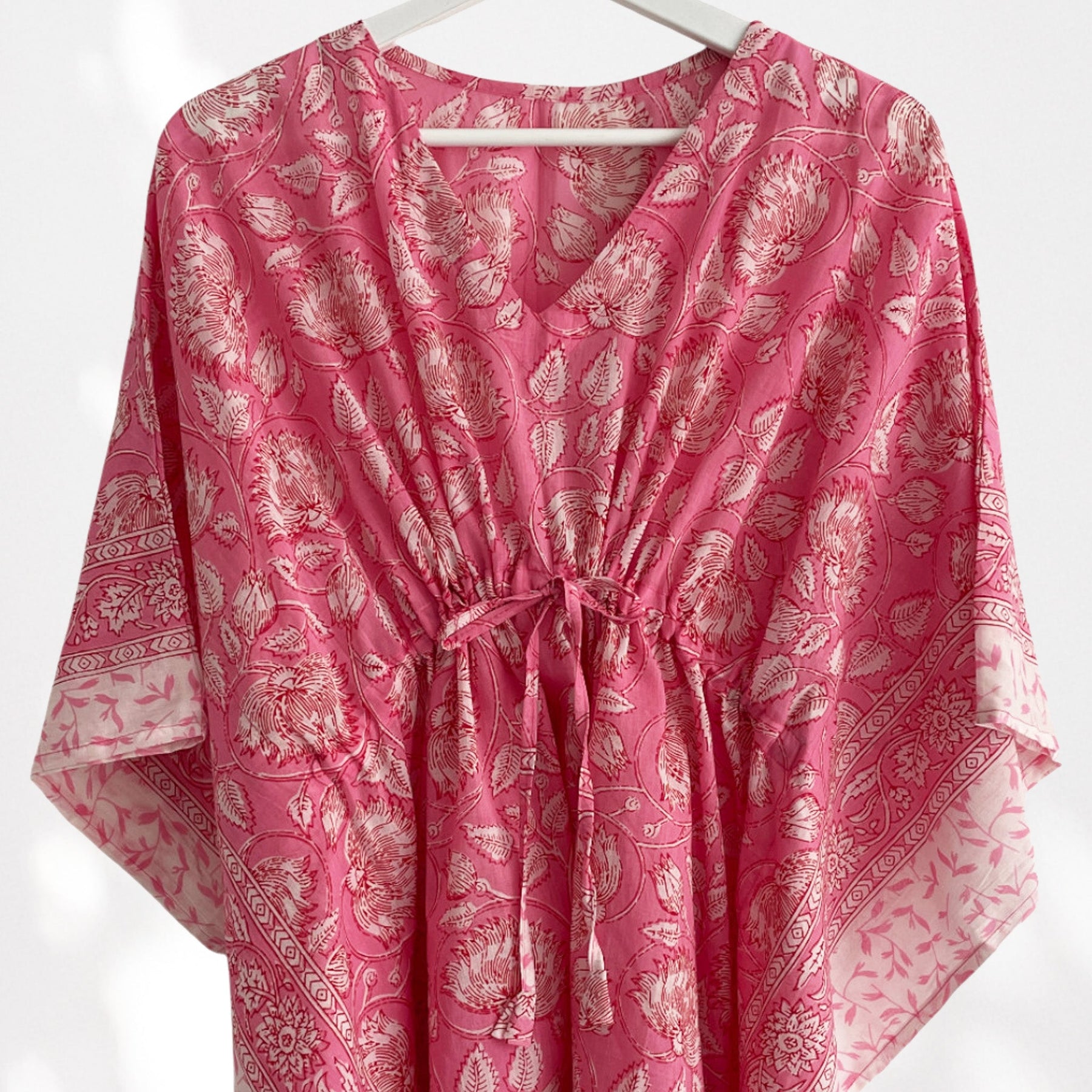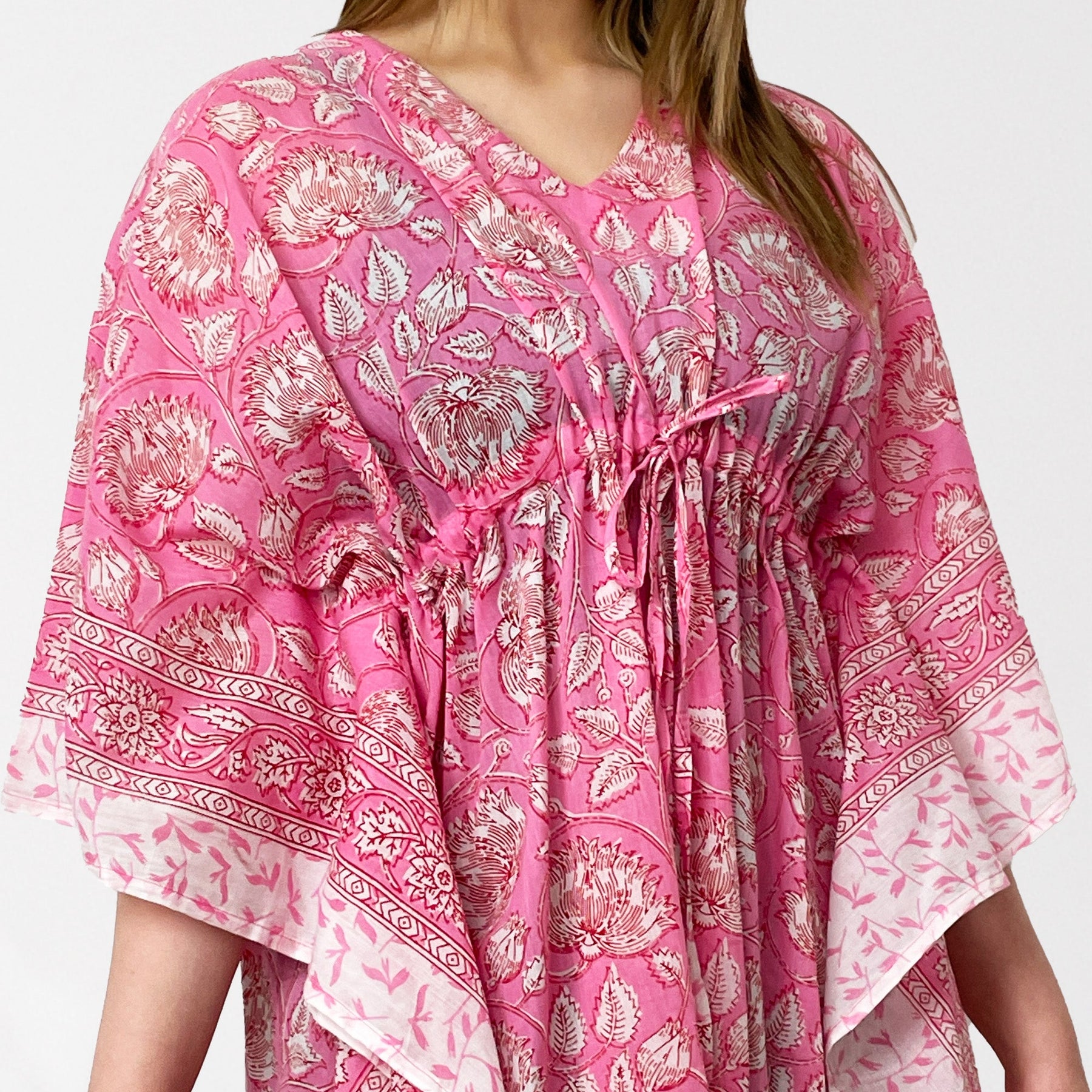 This Pink Floral print cotton kaftan is ideal for beach outings or transitioning seamlessly from the beach to the pool and bar.