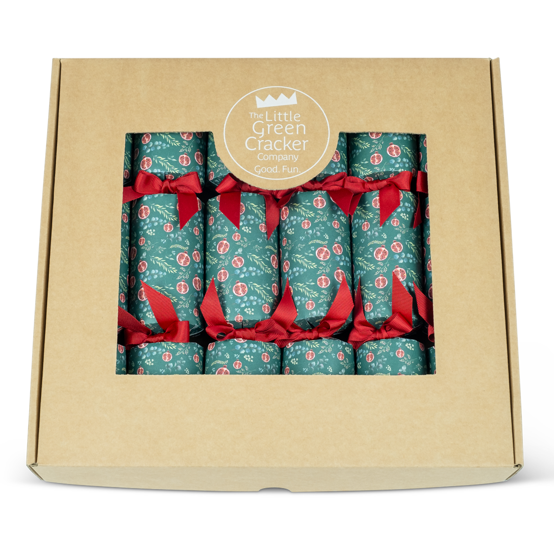 Six luxury Christmas crackers with a pomegranate design, matched with red recycled polyester ribbon.