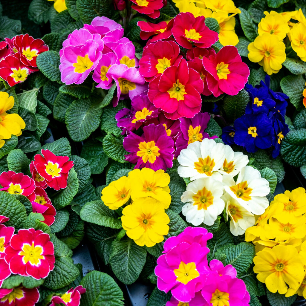 A vibrant rainbow of fragranced Primula 'Wanda Mix' flowers that will brighten the gloomiest of winter days - even through cold, wet and snow!