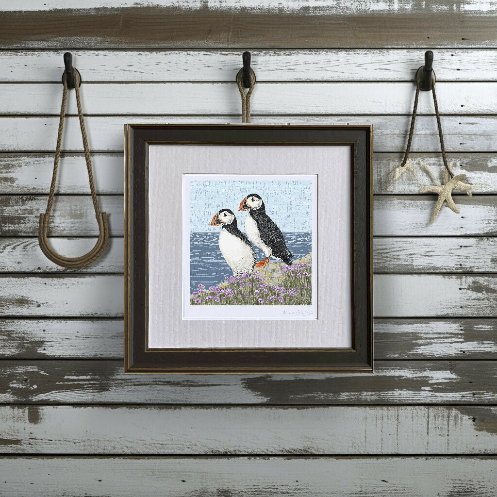 Inspired by the beauty of the British Countryside this hand-drawn print with an etched feel depicts a pair of Puffins surrounded by sea thrift and inky blues of the sea