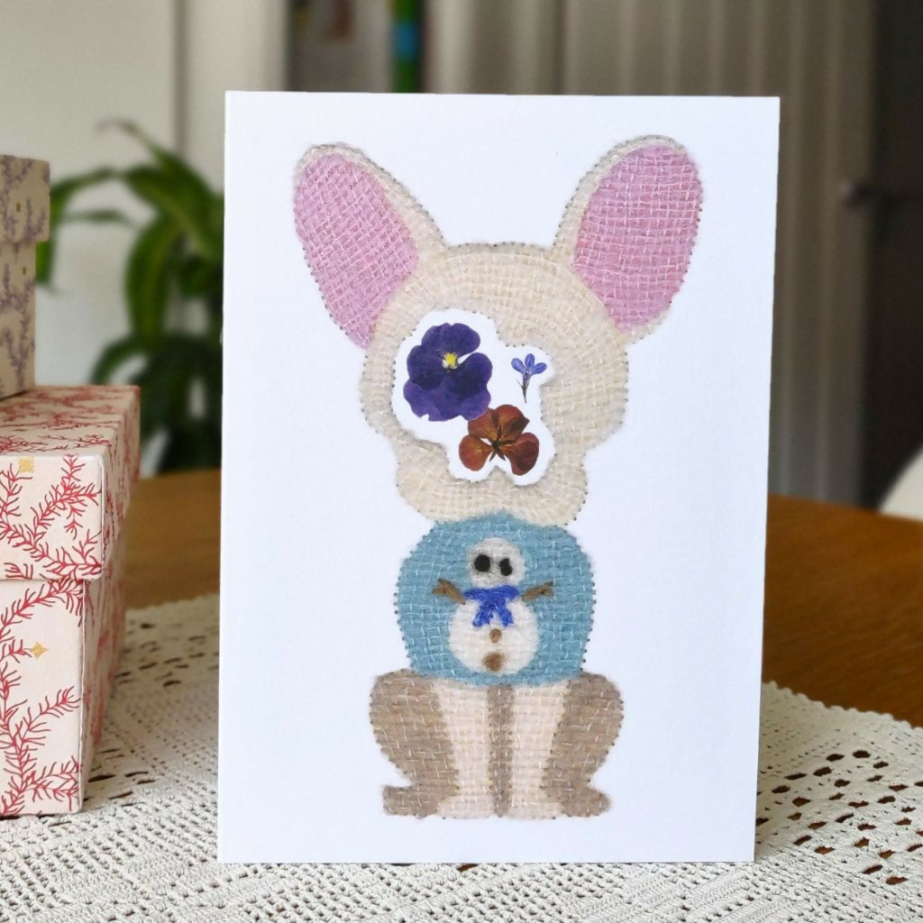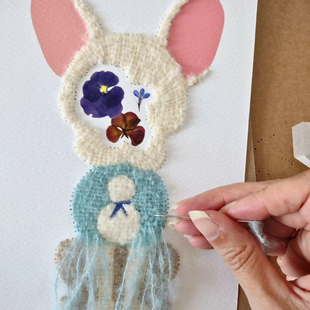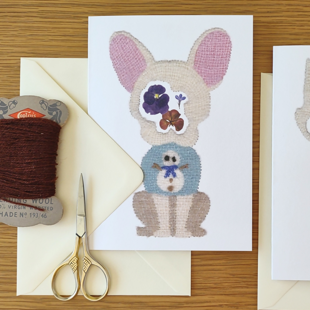 Quentin started life by being hand embroidered onto paper, before he was digitalized for this printed card.