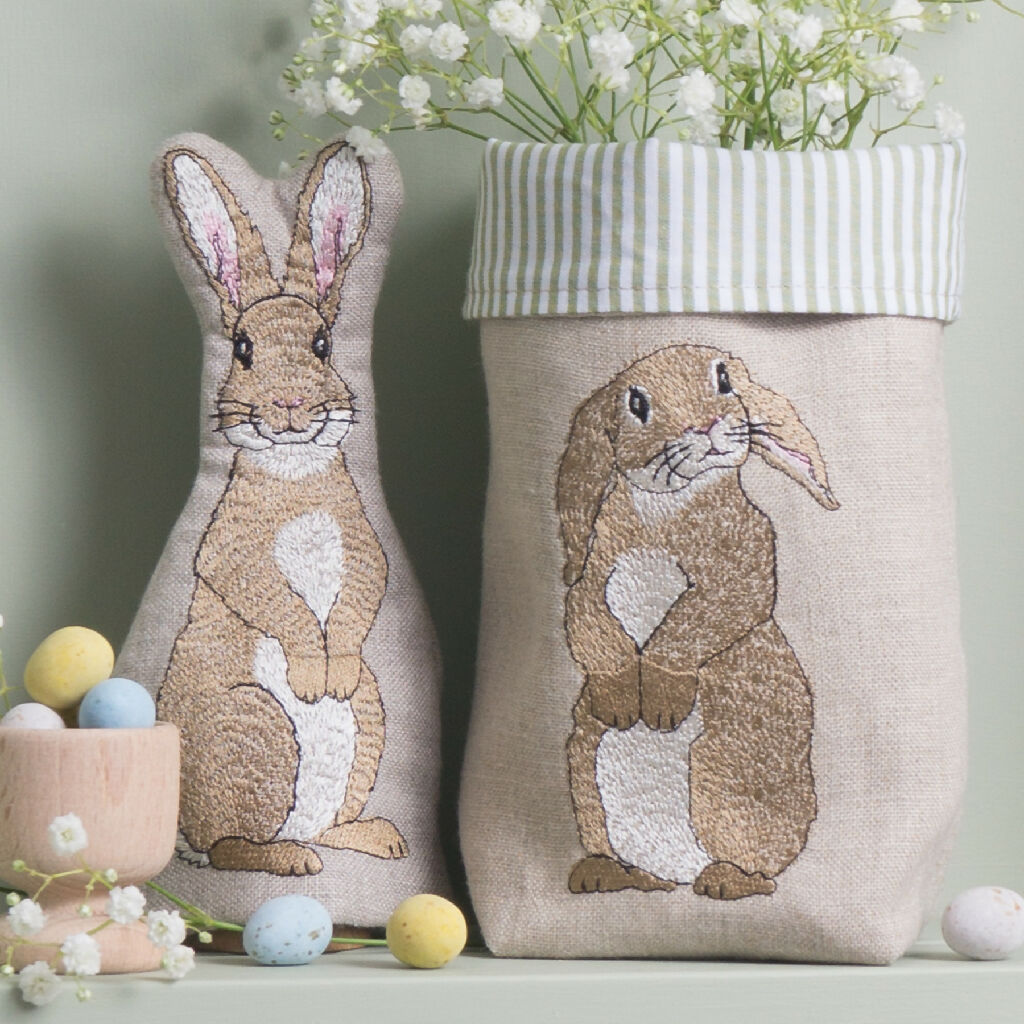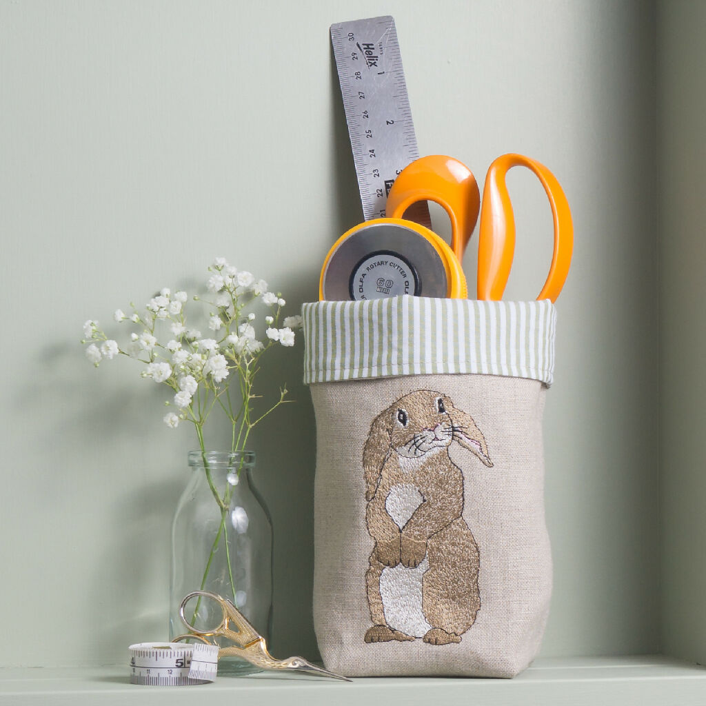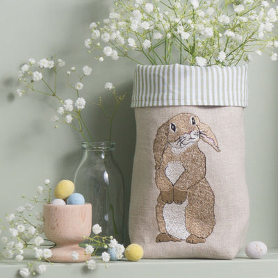 Featuring a cheeky embroidered floppy eared rabbit, this fabric pot is perfect to fill with chocolate eggs for a beautiful Easter gift.