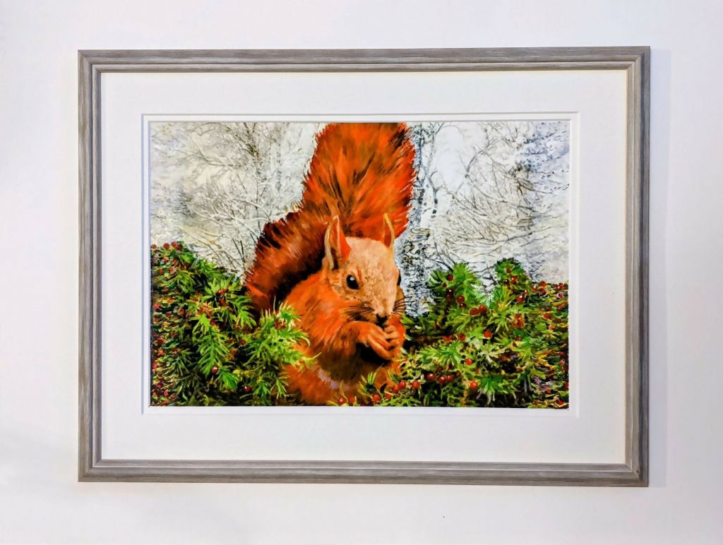 A beautiful original painting of a Red Squirrel surrounded by berries and a snowy background. The Red Squirrel with it's bright fur stands out against the background . The painting is titled signed doubled mounted and framed behind glass. Size of framed painting . 50 cm x 39 cm