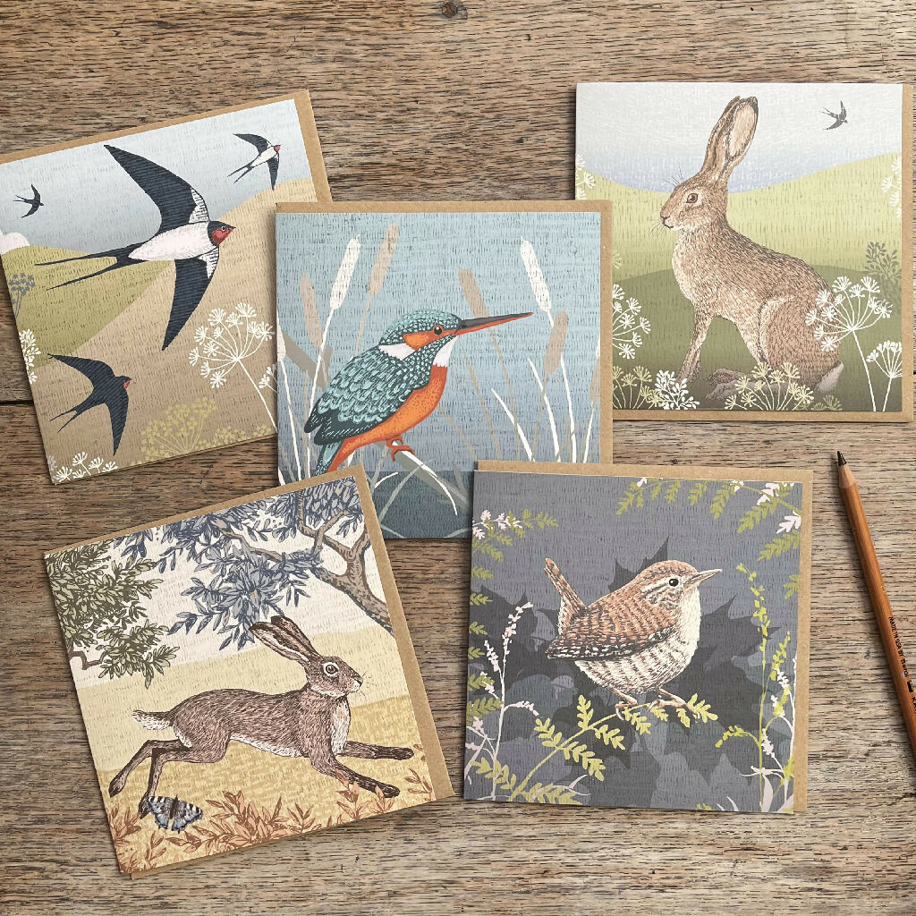 Swallow, Hare, Kingfisher, Navy Wren and Running Hare.