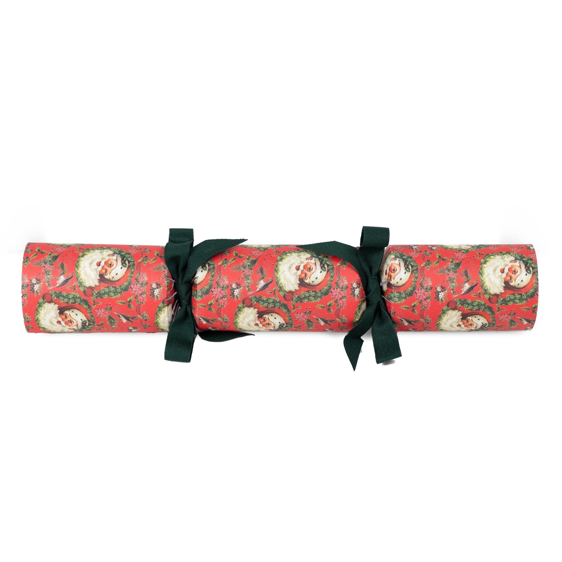 Six luxury Christmas crackers with a colourful retro Santa design, matched with biodegradable tencel ribbon.