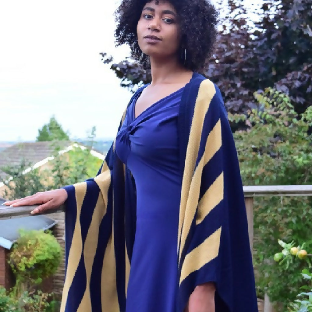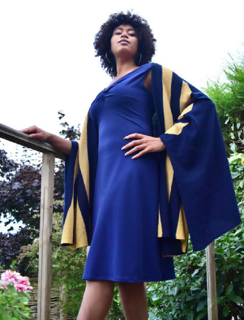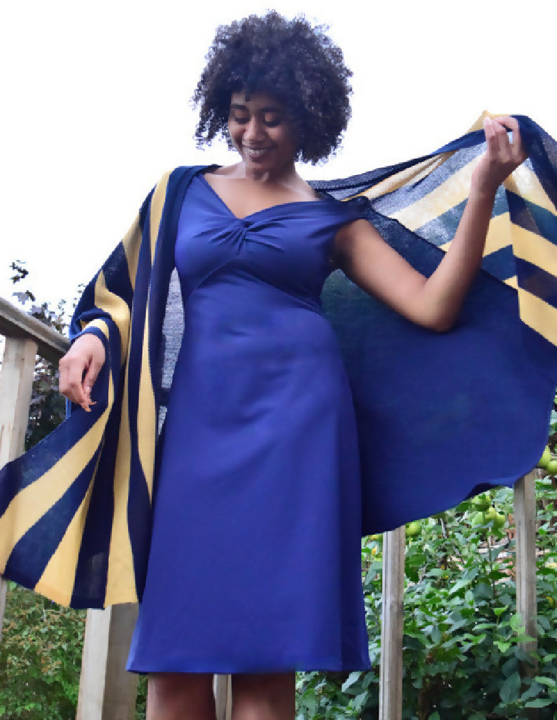Sasha Dress is available in French Navy. The Swimwear Fabric is Upcycled and bought and made within 13 miles of our Studio for a careful Ecofootfall. The flattering twist Bardot neckline can be worn on or off the shoulder. The skirt flares out gently from under the bust seam into a Swing Skirt Shape.