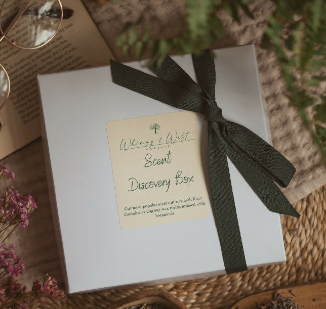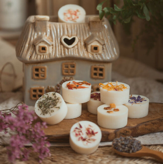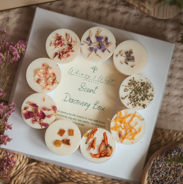 Each 20g wax melt is beautifully finished with dried botanicals and the set of 9 are presented chocolate-box style and tied with a ribbon, with each melt in it's own compartment, so they keep their individual scents and don't blend into one!