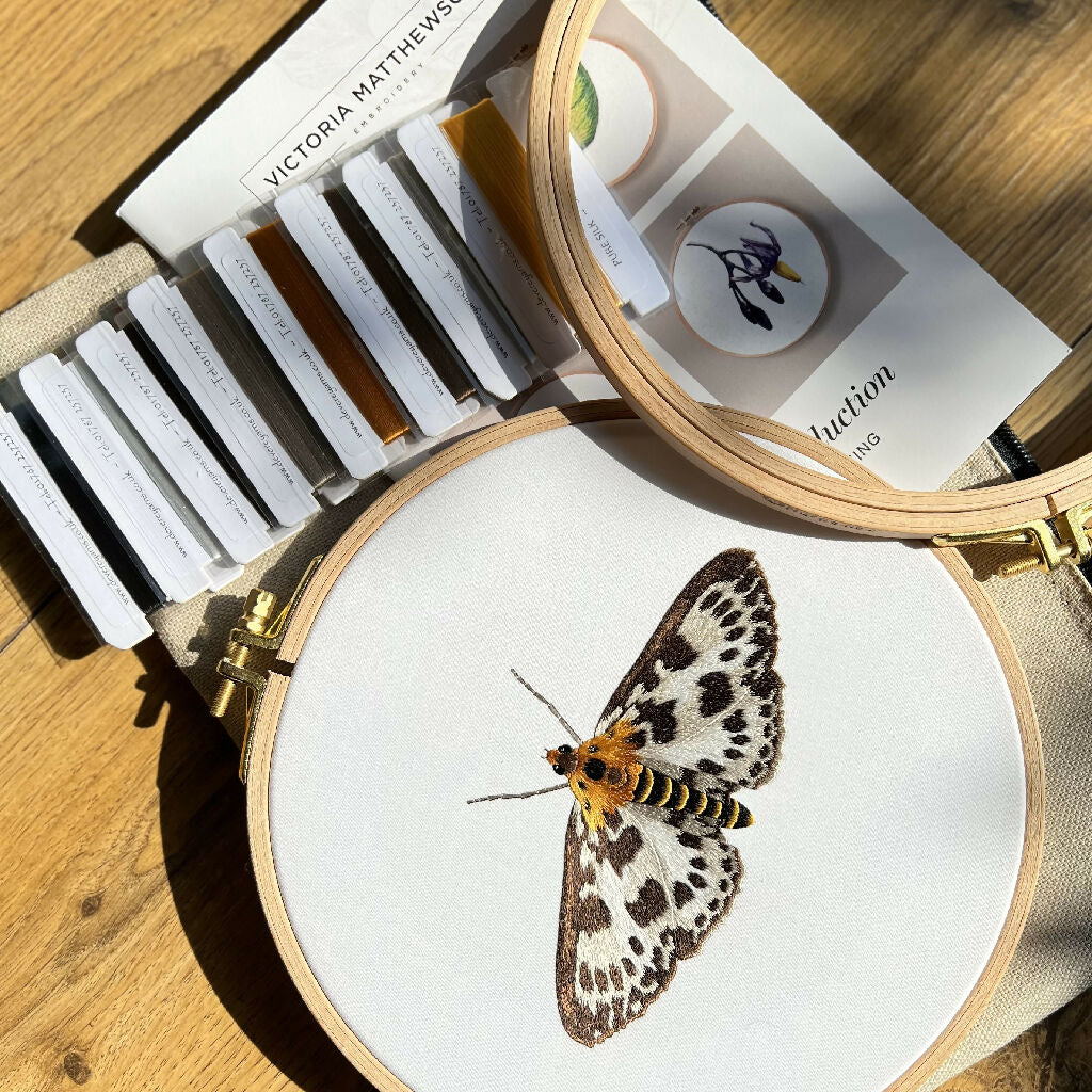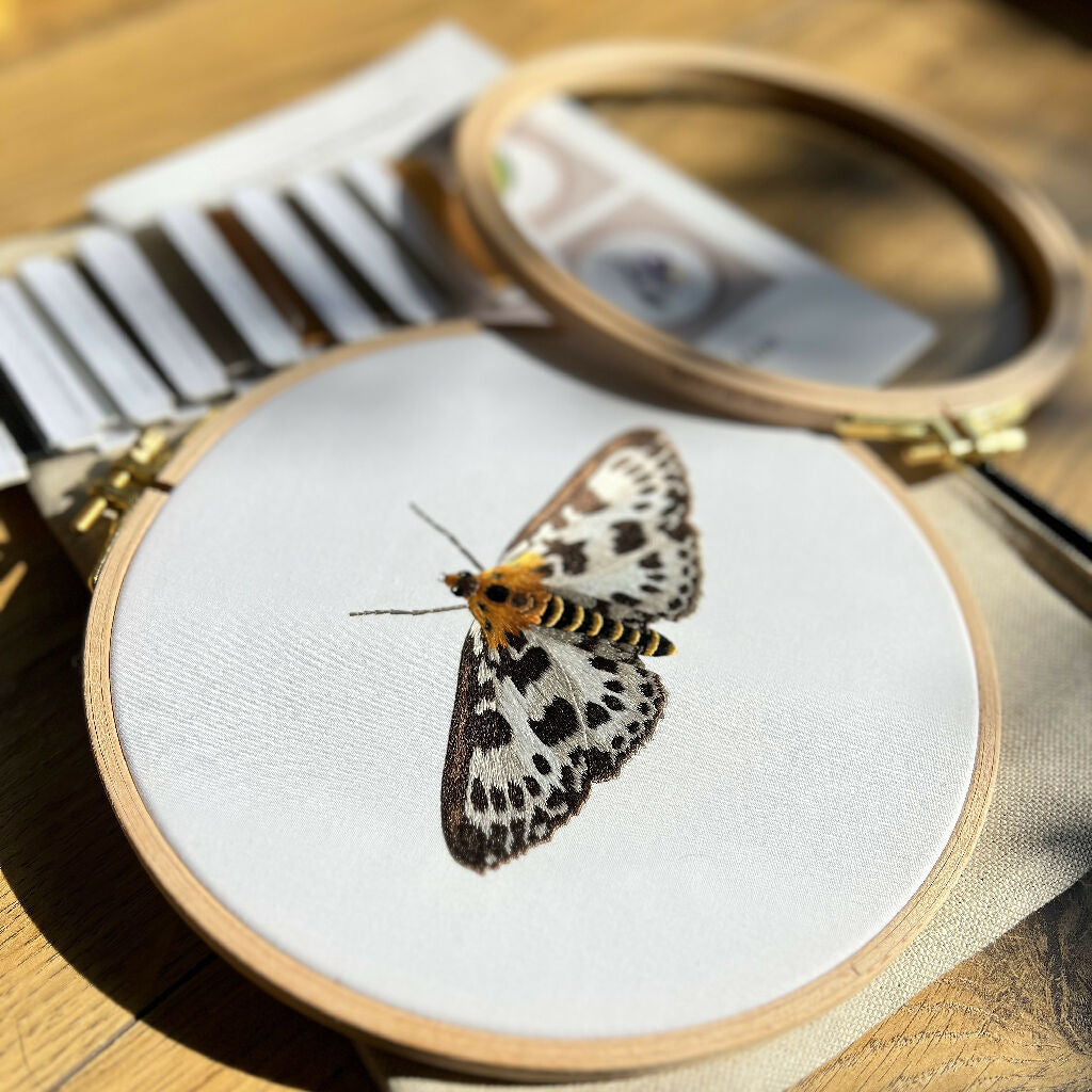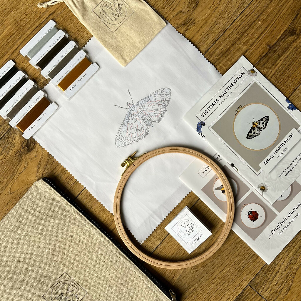 Embroidery kit containing everything you need to stitch this beautiful small magpie moth. Including 8 cards of fine silk floss, needles, instructions, pre-printed fabric and a beech embroidery hoop. All neatly stored in a hemp cotton fabric zip case that allows you to safely store your kit while you are not stitching.