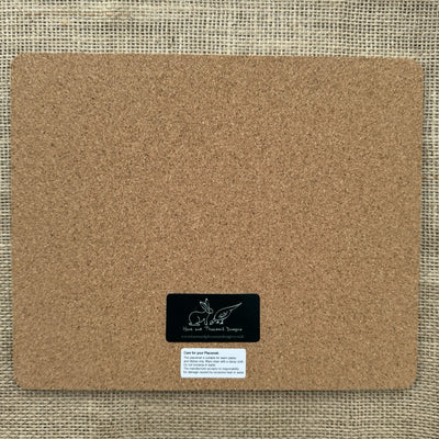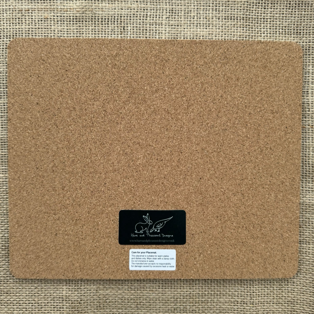 The placemat is wipeable and built to withstand heat and moisture. The inside is made from eucalyptus hardboard for lasting longevity. The placemat is backed with a non-slip cork.