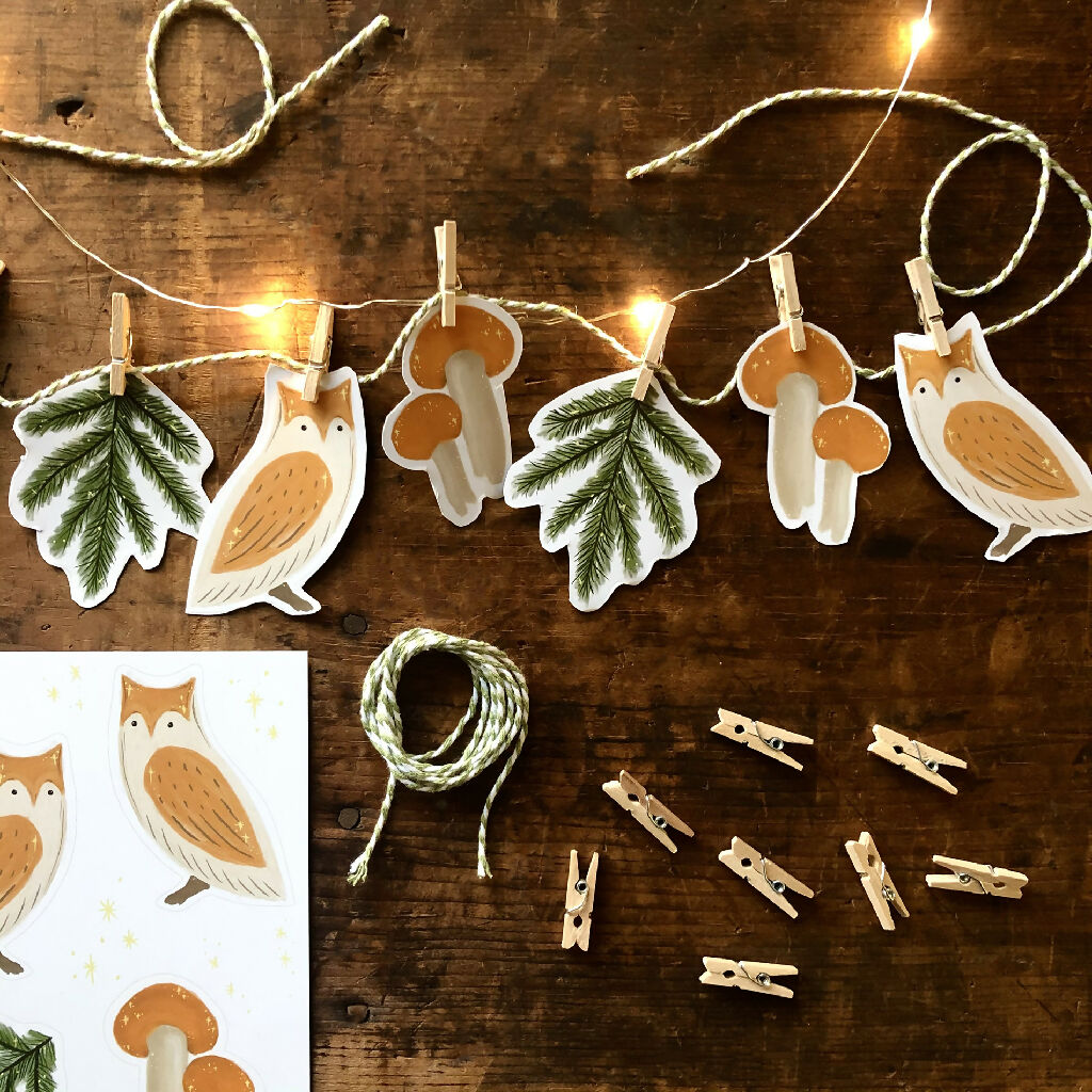 We’ve also designed a little paper garland for you to assemble, featuring owls, toadstools and greenery. Simply cut out each item along the lines, and attach each one to the sage green baker’s twine using the miniature pegs. Make a small loop at each end, then find a special place to hang it to bring even more owl magic to your home!