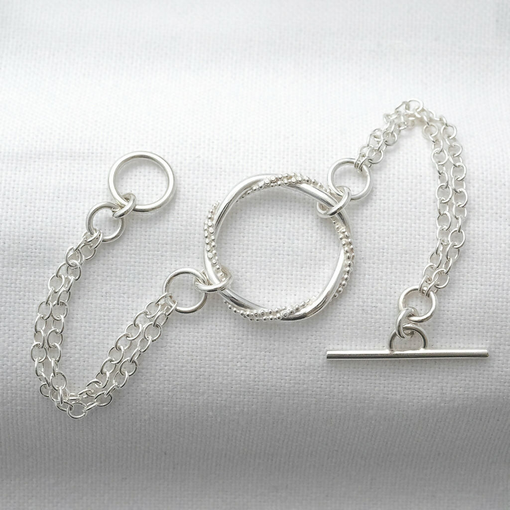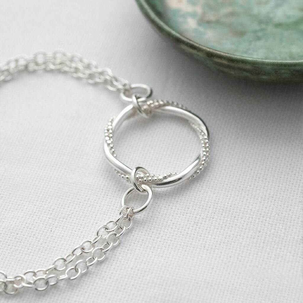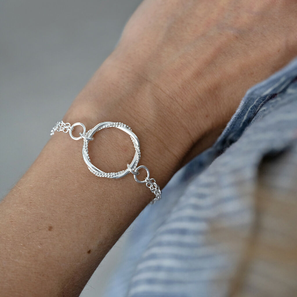 This timeless hallmarked silver bracelet is a beautiful accessory for those special occasions. With its delicate appearance and intricate detailing, this piece showcases my handmade entwined ring.