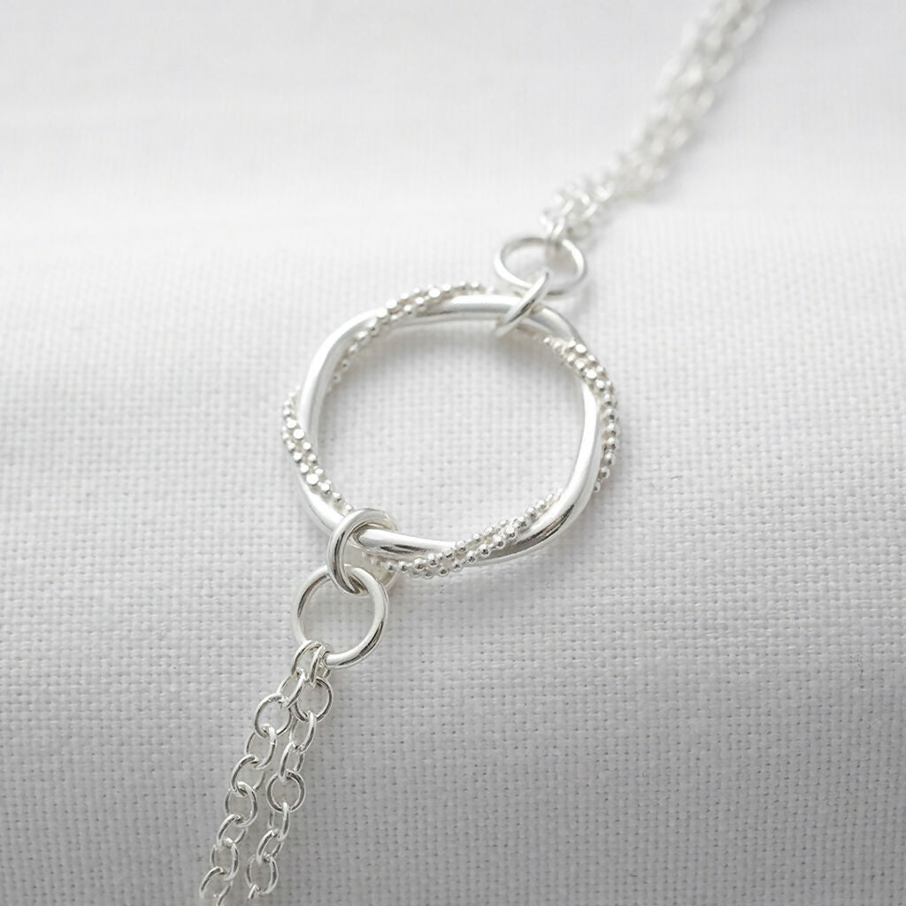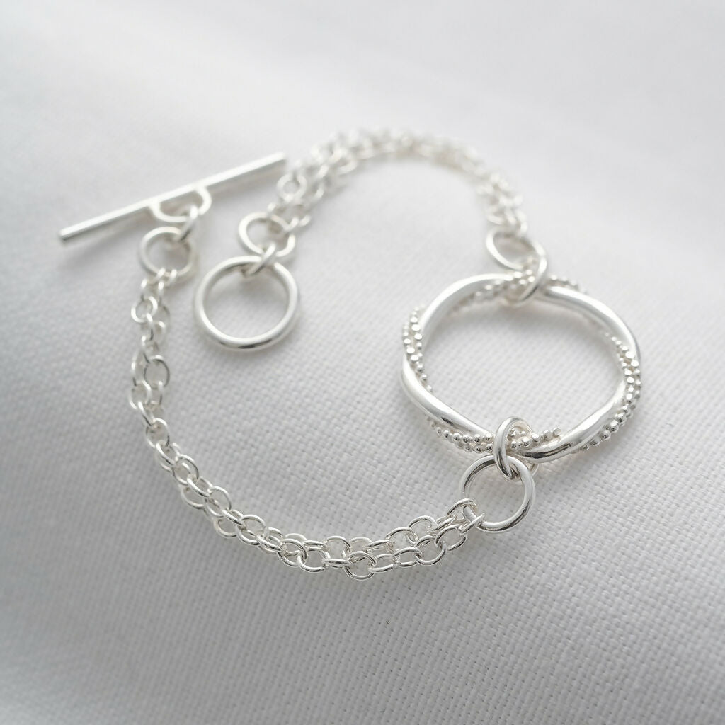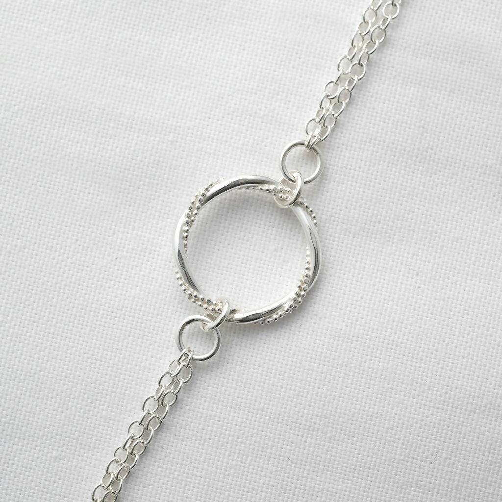 This timeless hallmarked silver bracelet is a beautiful accessory for those special occasions. With its delicate appearance and intricate detailing, this piece showcases my handmade entwined ring.