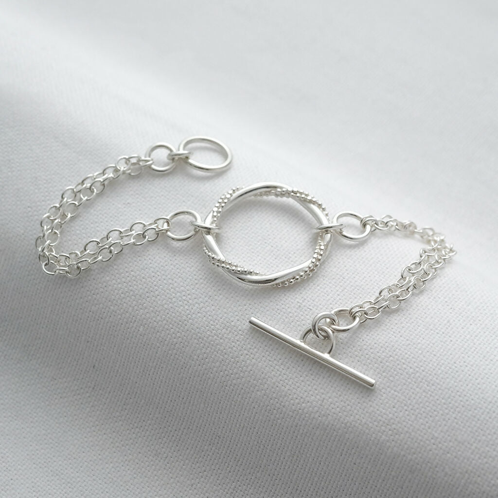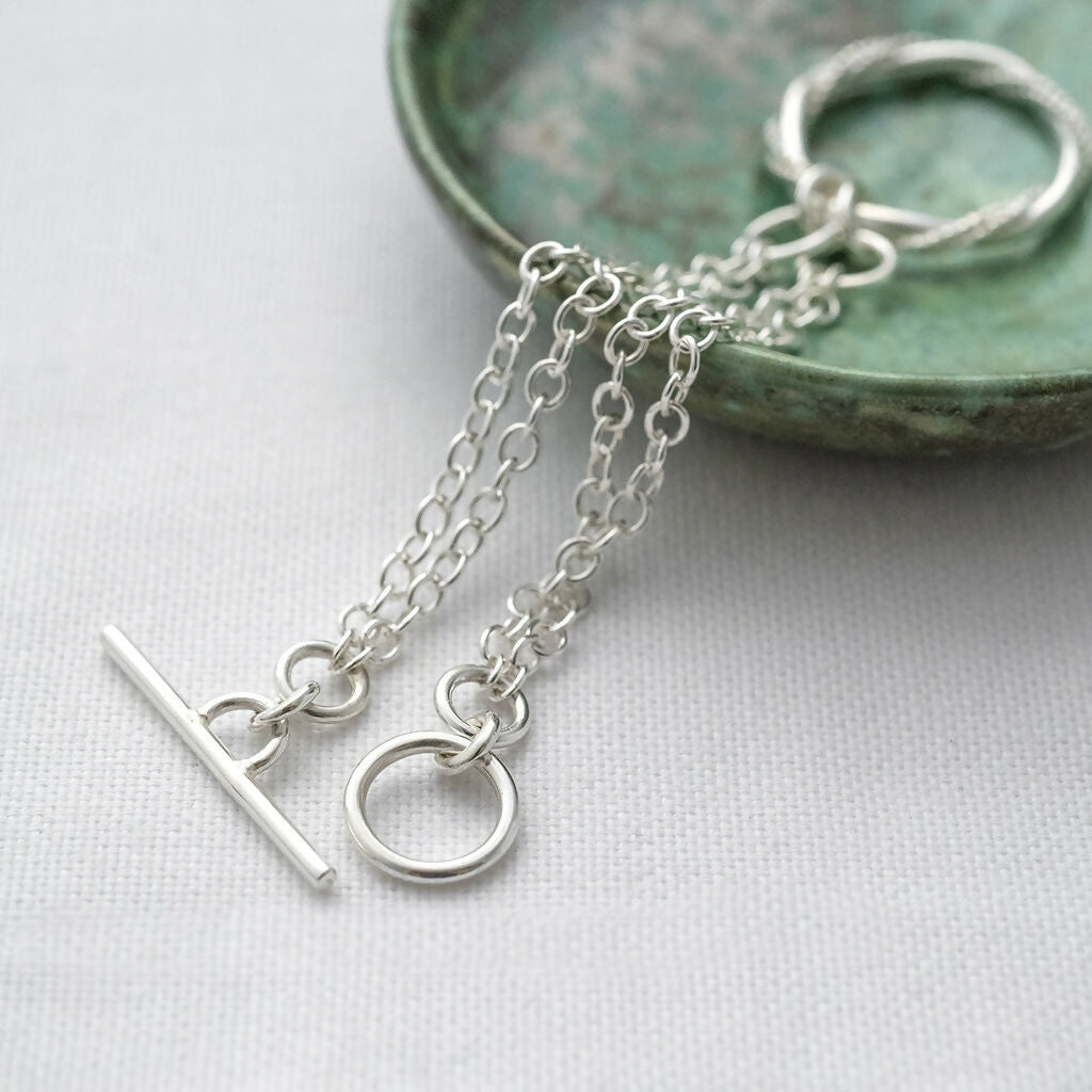 The ring is attached to a sterling silver double plain trace chain and finished with a toggle clasp for a secure and effortless fastening.