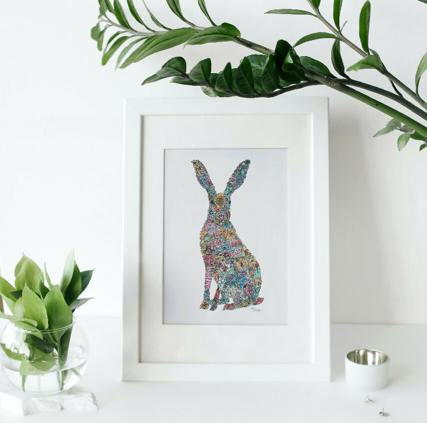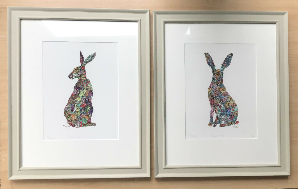 The second of my seasonal hare prints, crammed full of Summer flowers depicted in pen and ink.
