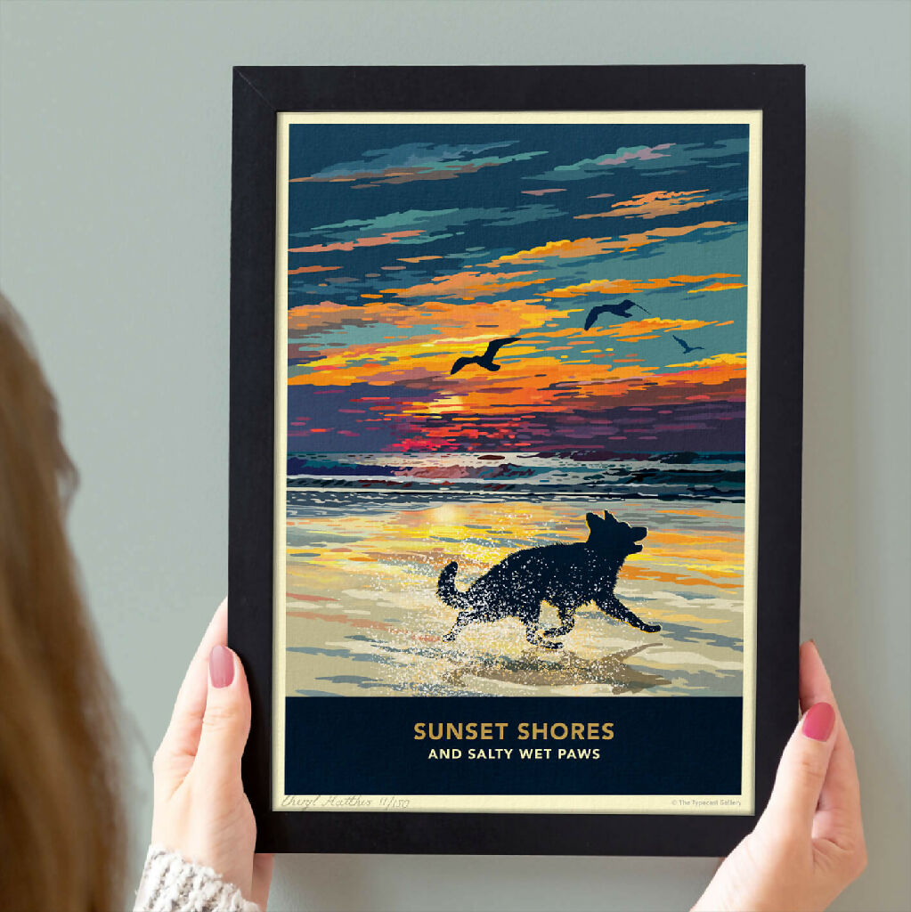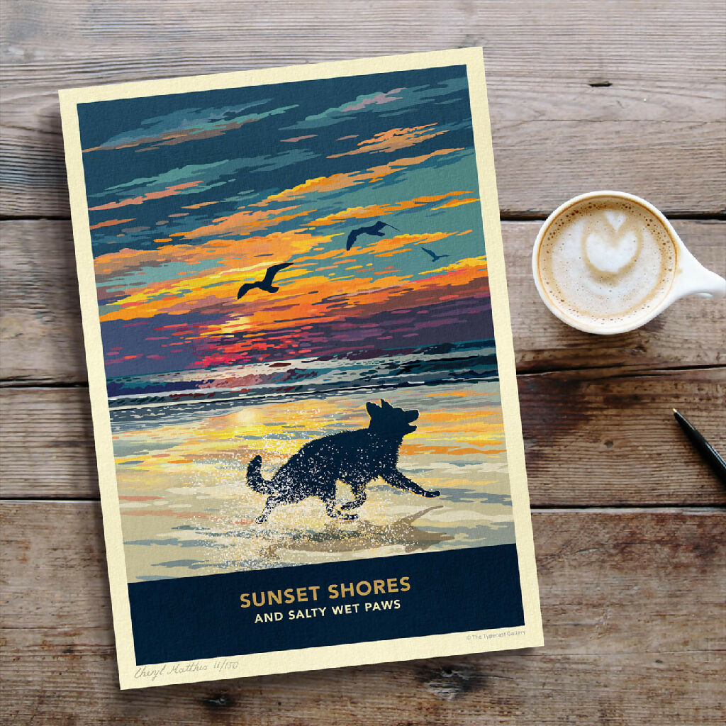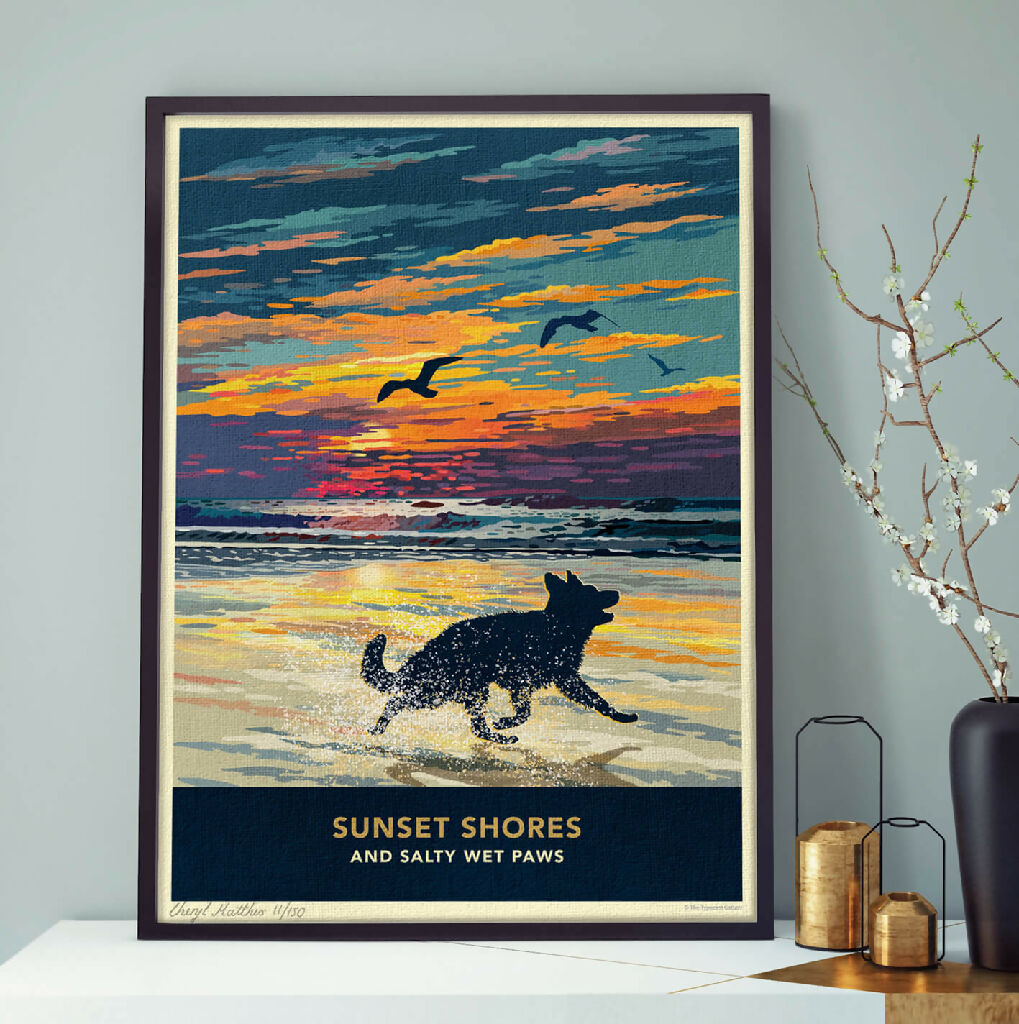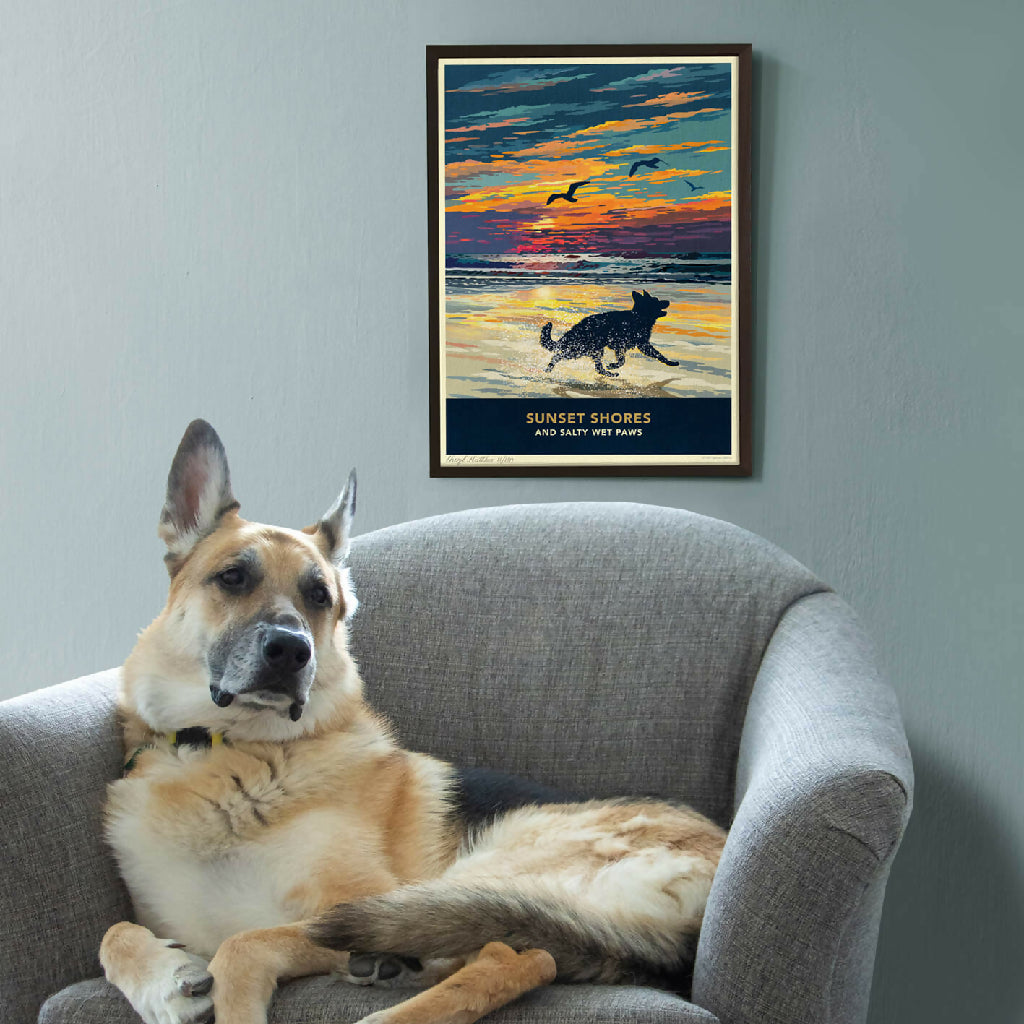 Celebrate vibrant sunsets, sweeping coastal seascapes, and refreshing walks along the shore with this beautiful german shepherd silhouette print. Each piece is individually signed and numbered as part of limited-edition print runs.