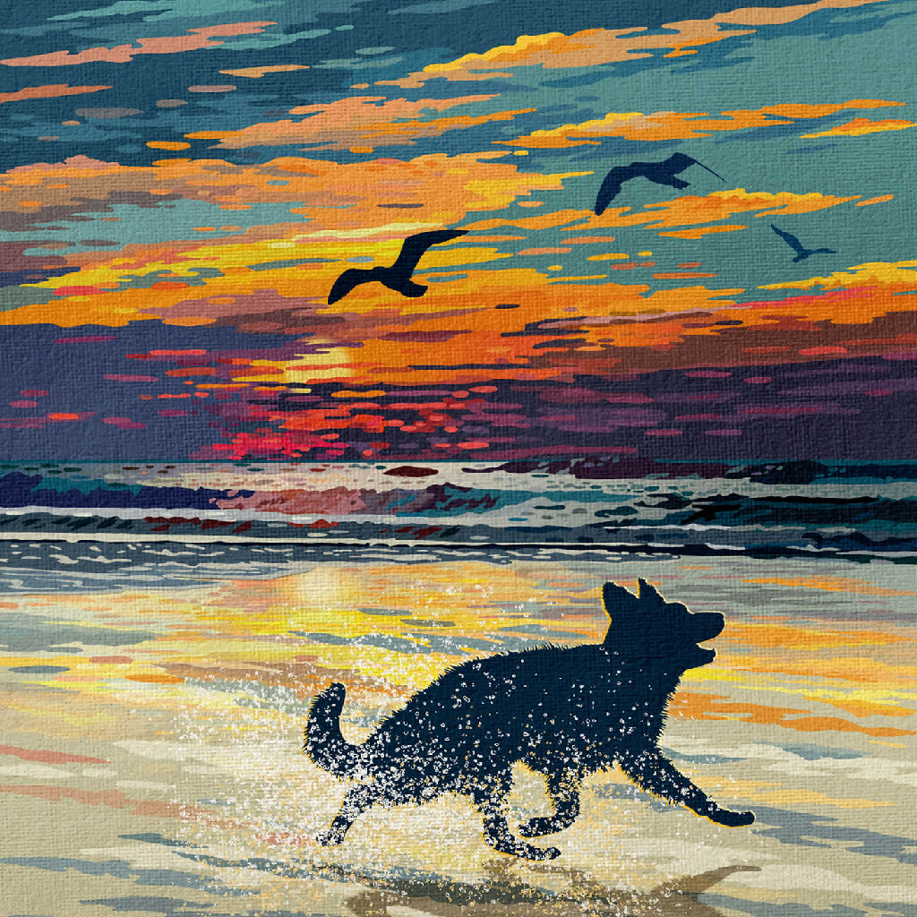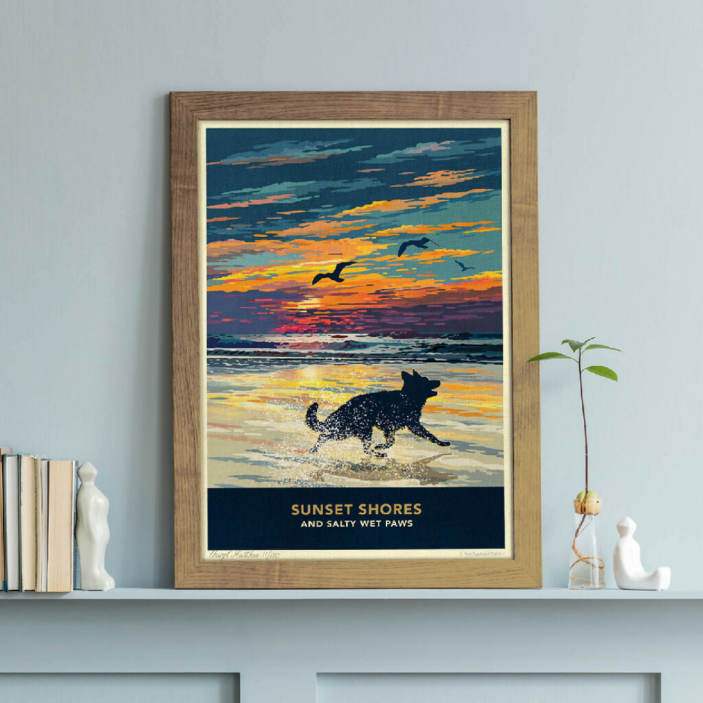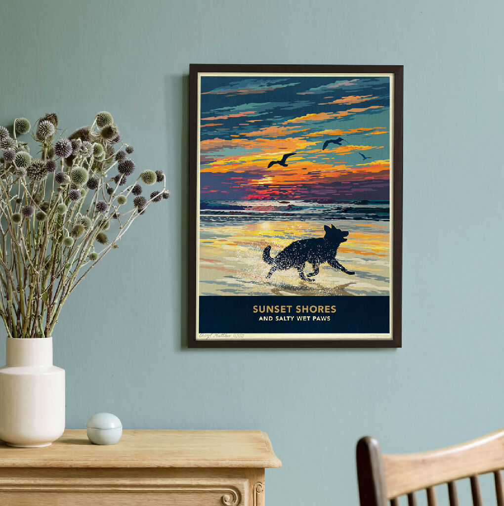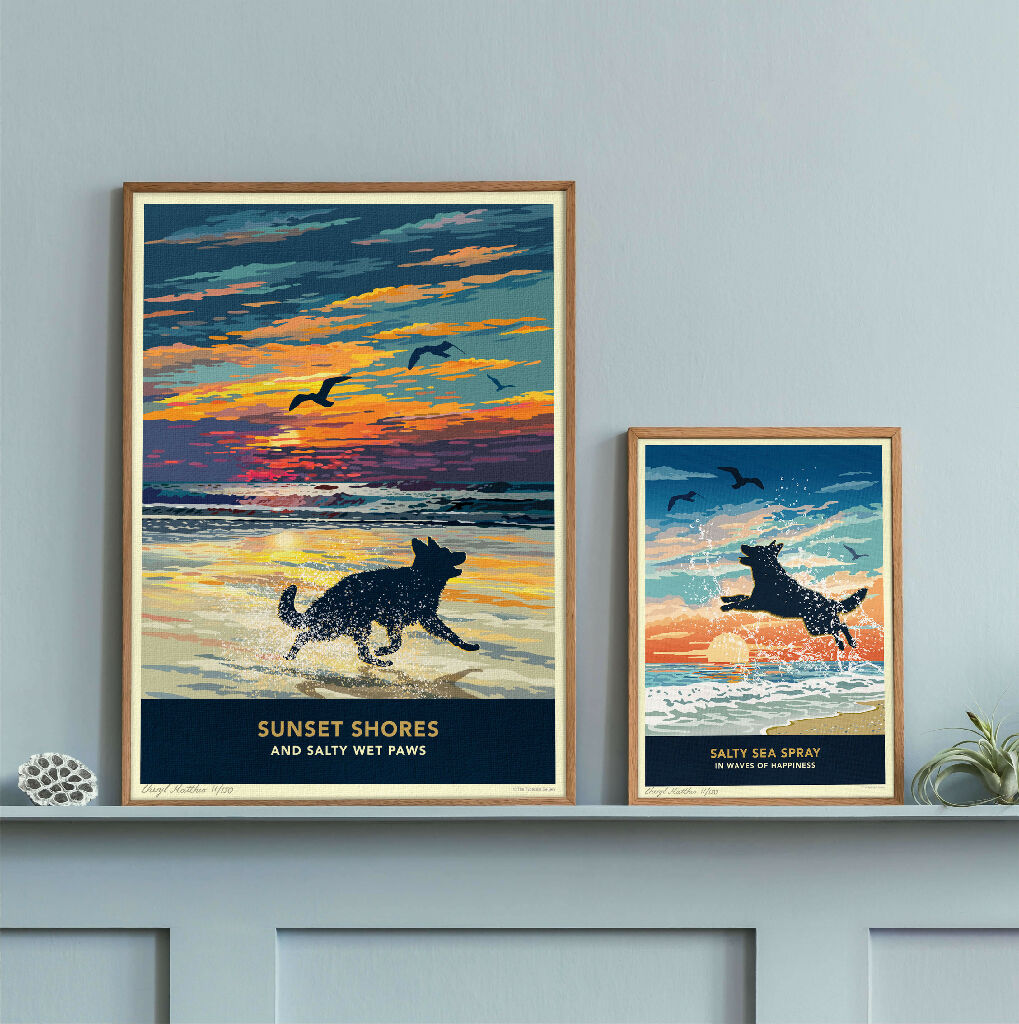 Celebrate vibrant sunsets, sweeping coastal seascapes, and refreshing walks along the shore with this beautiful german shepherd silhouette print. Each piece is individually signed and numbered as part of limited-edition print runs.