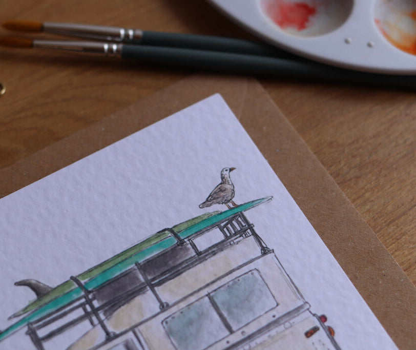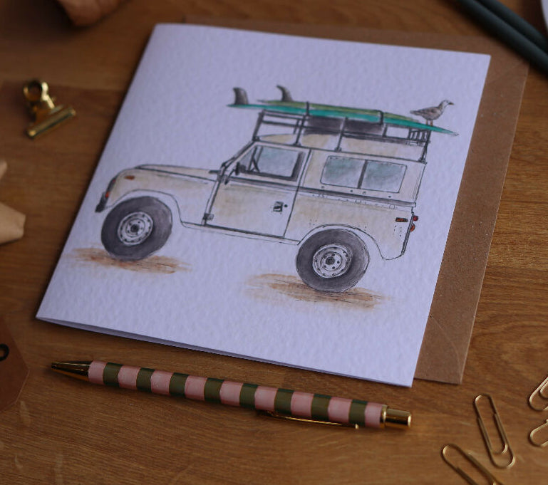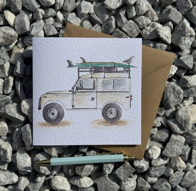 Featuring a watercolour illustration of Defender ready for surfing with a seaside friend. Why not create the perfect gift and pair it with a matching keyring or coaster.
