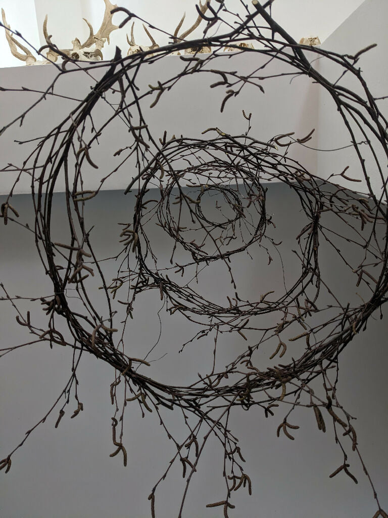 Create a light, natural statement in your home with this hand-tied suspended wreath made from delicate birch branches. Designed on a sturdy wire frame and finished with four ties for balanced hanging, this elegant piece brings organic texture and Scandinavian-inspired simplicity to any space.