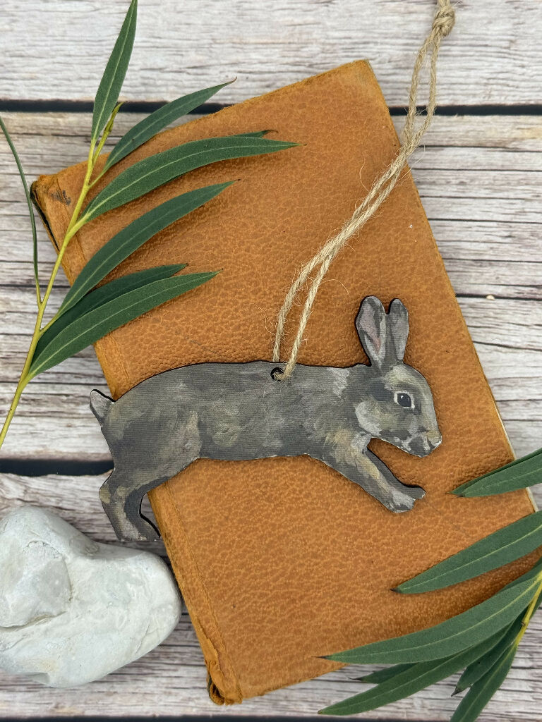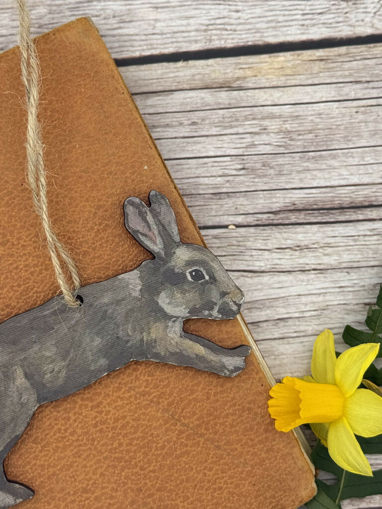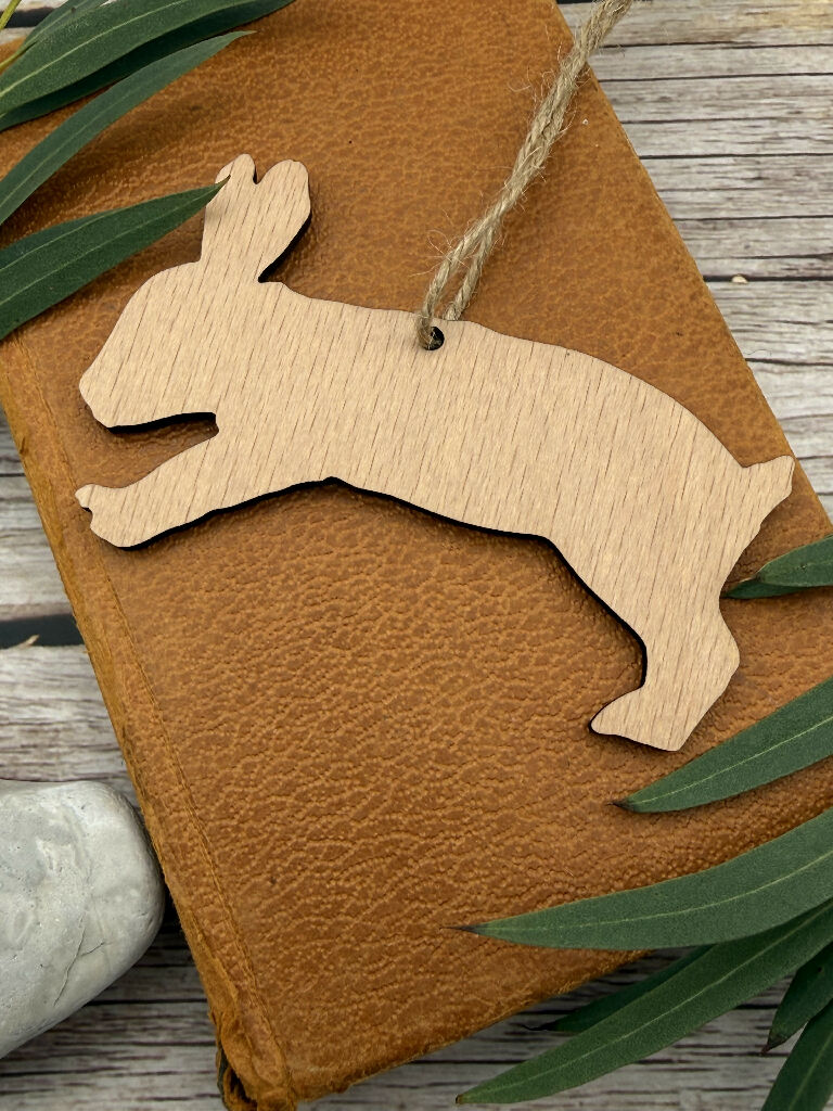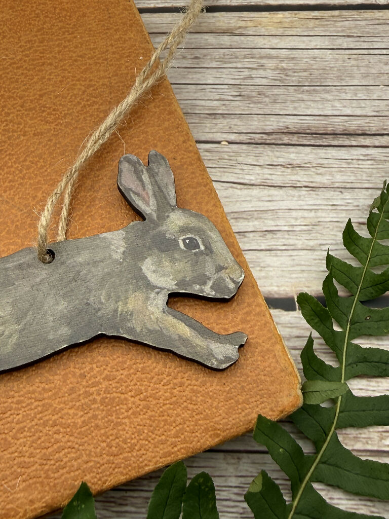 Fsc-certified Wooden Decoration of a wild rabbit jumping. Strung with natural jute twine for a natural look and feel.