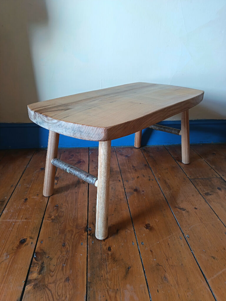 This hand-made coffee table is made from a beautiful solid piece of sweet chestnut. It has turned ash legs and hazel stretchers. It has beautiful grain and the hazel bark is an attractive feature. The hazel comes from my own woodland on the Isle of Wight.