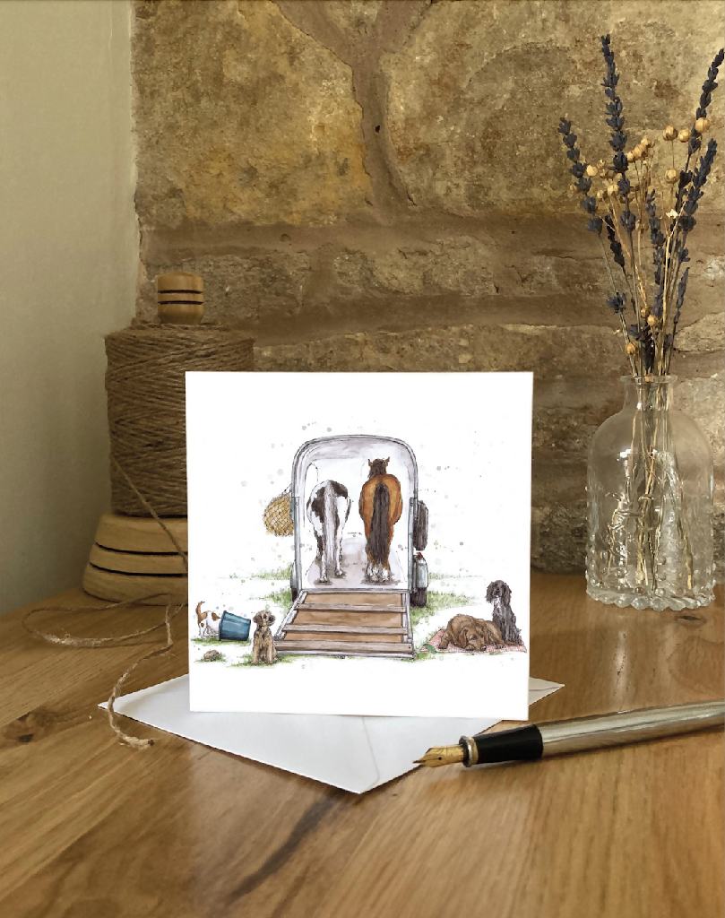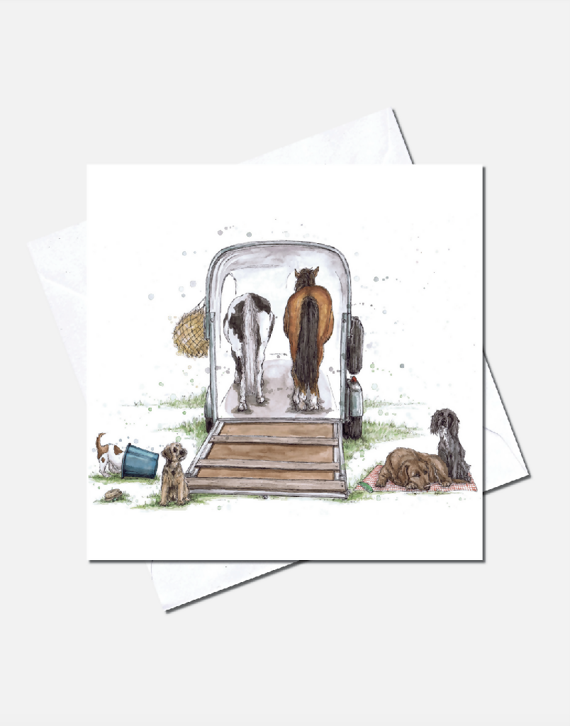 featuring a quirky illustration of two ponies in a horse box with their canine companions.