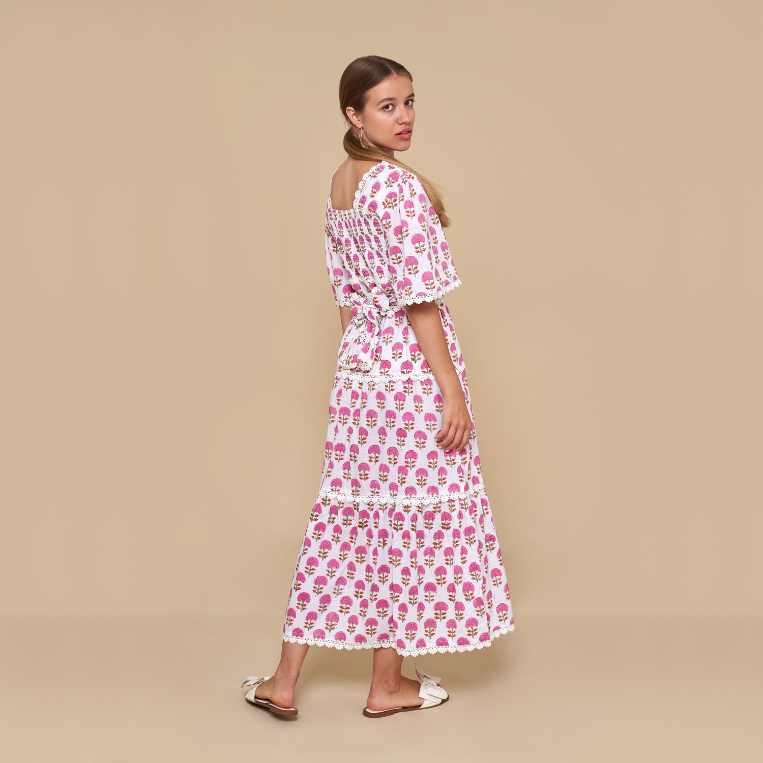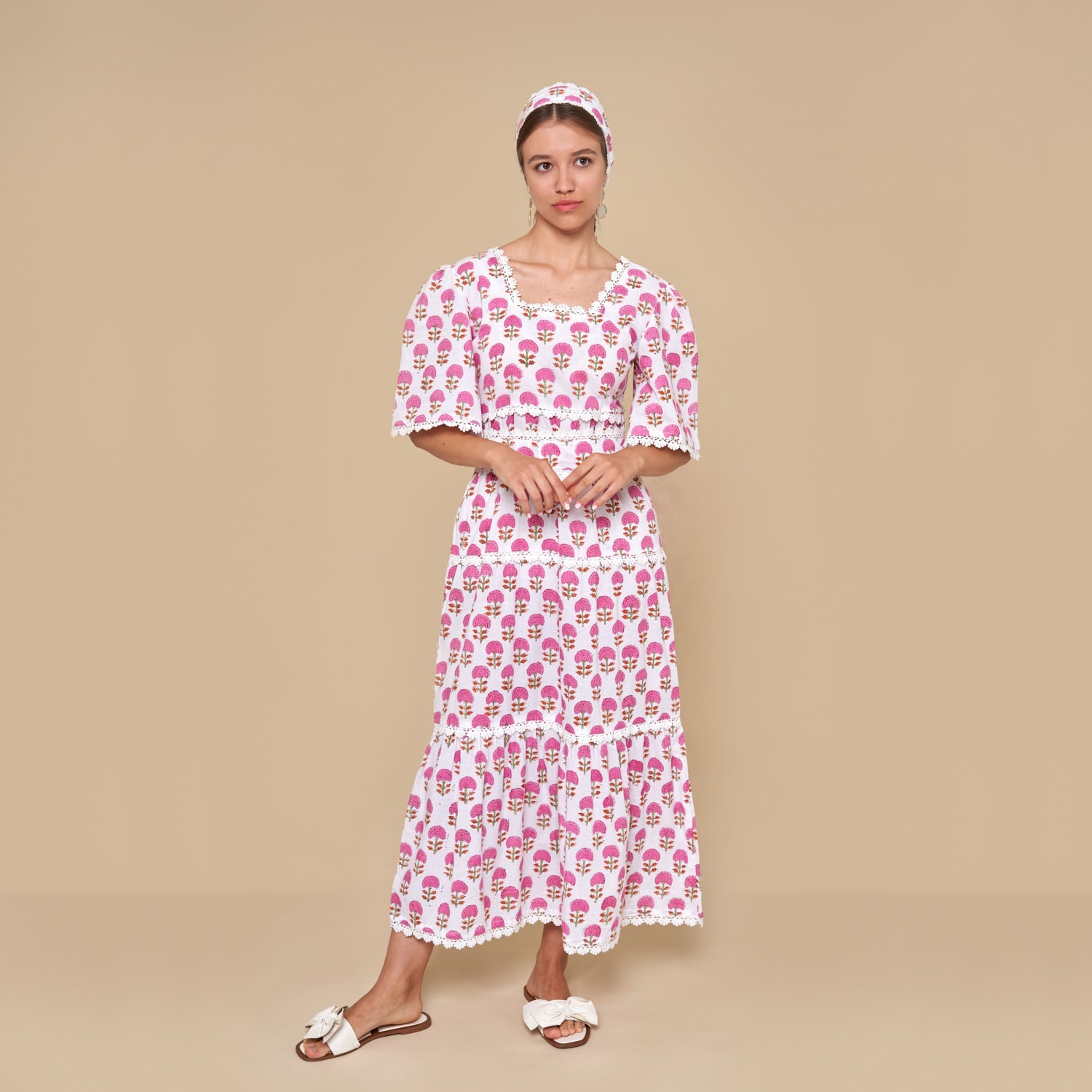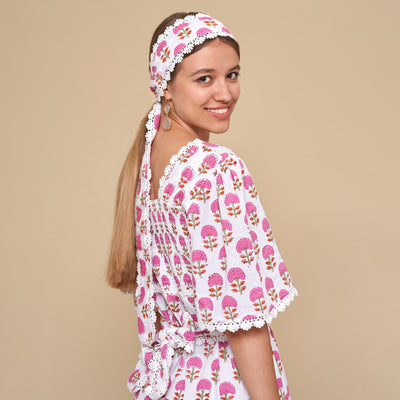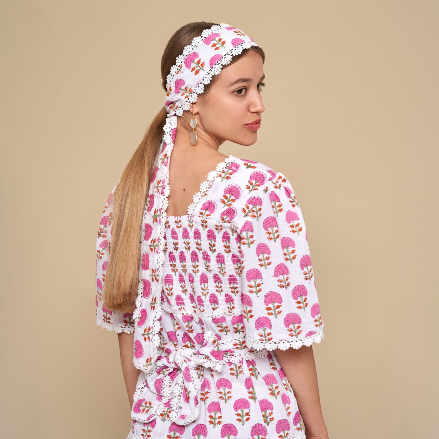 Completing the ensemble are two included optional accessories — which can be worn as a belt, a headband or a scarf. A perfect pink wedding guest dress!