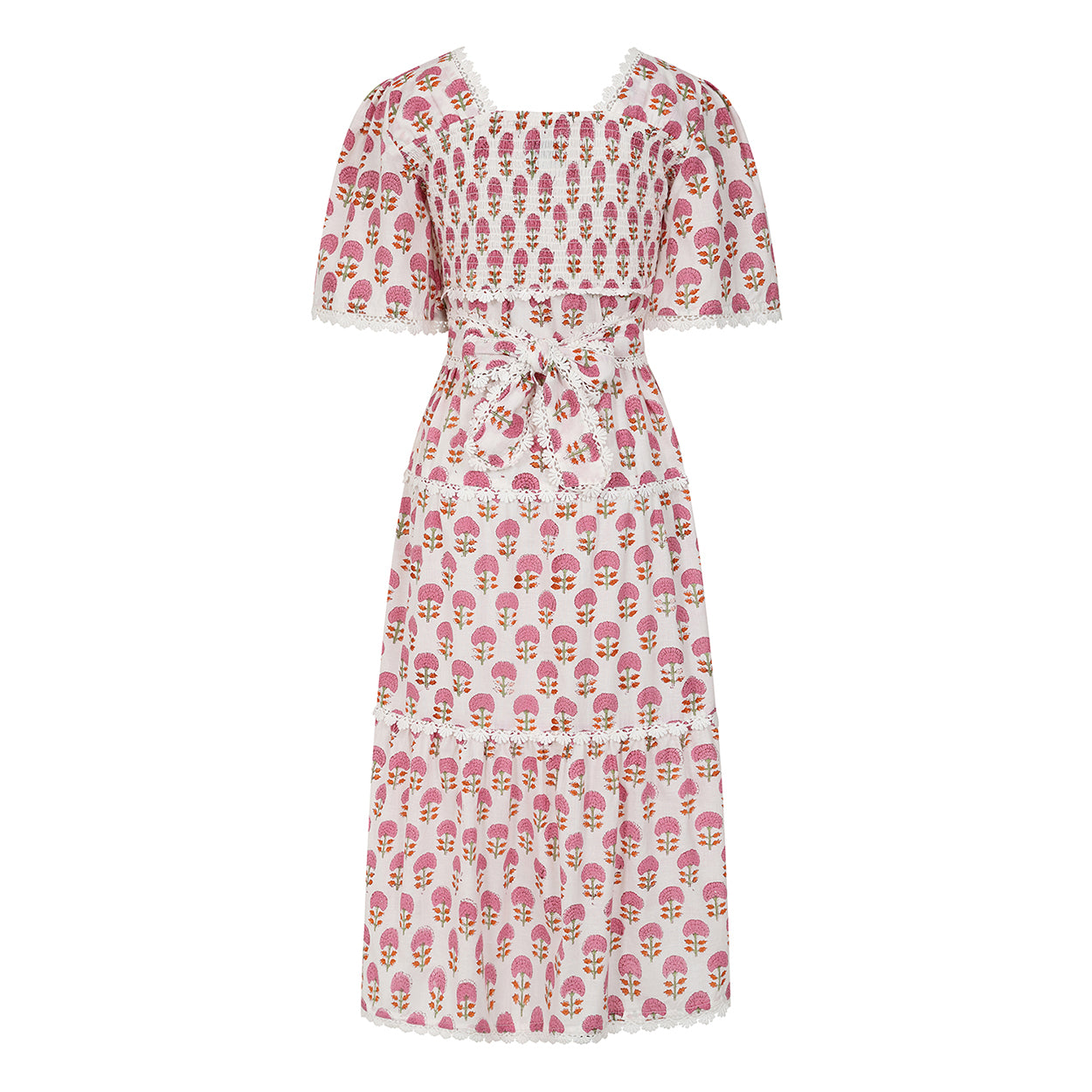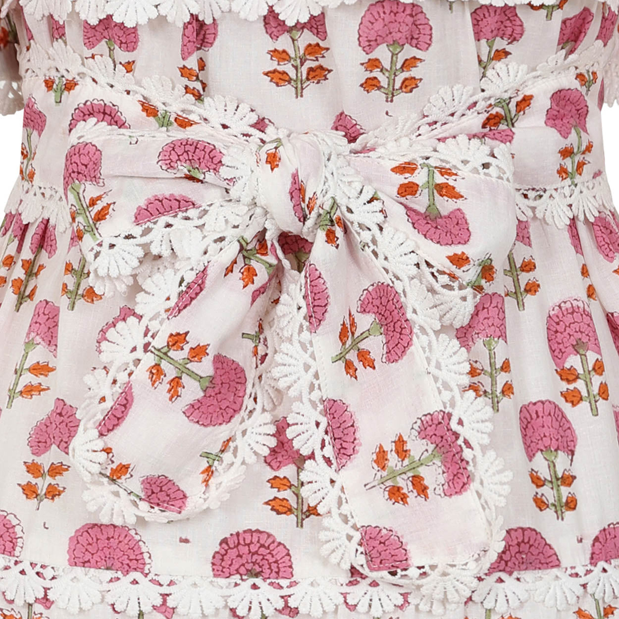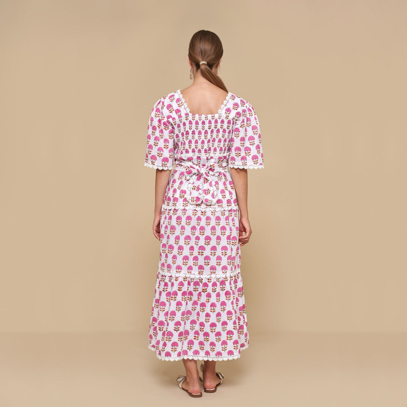 Completing the ensemble are two included optional accessories — which can be worn as a belt, a headband or a scarf. A perfect pink wedding guest dress!
