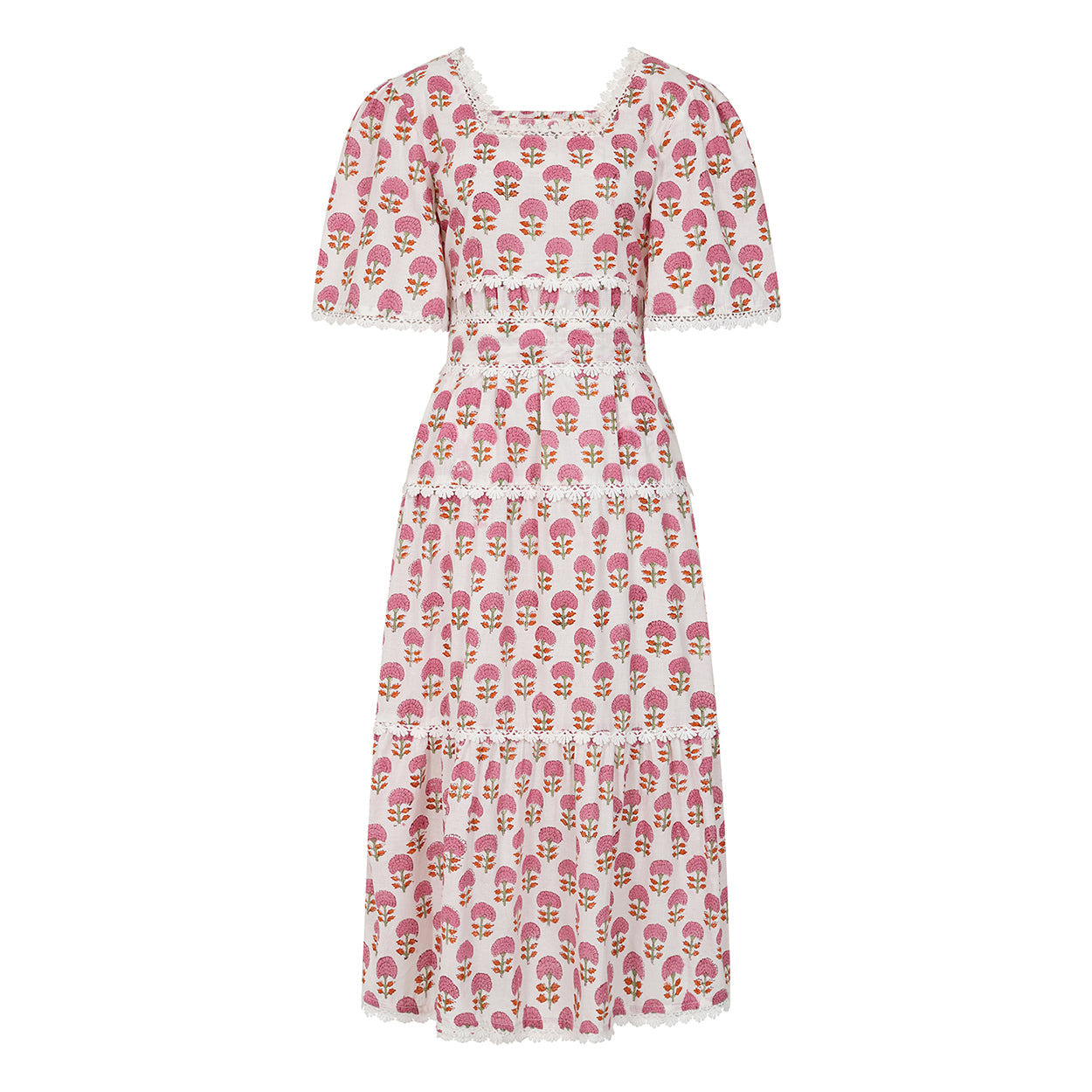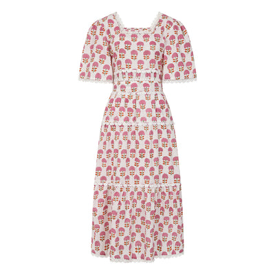 Delicate scalloped lace intricately adorn the fabric. The square neckline, adorned with intricate lace detailing, exudes sophistication, while the shirred back bodice guarantees both a snug fit and exceptional comfort.