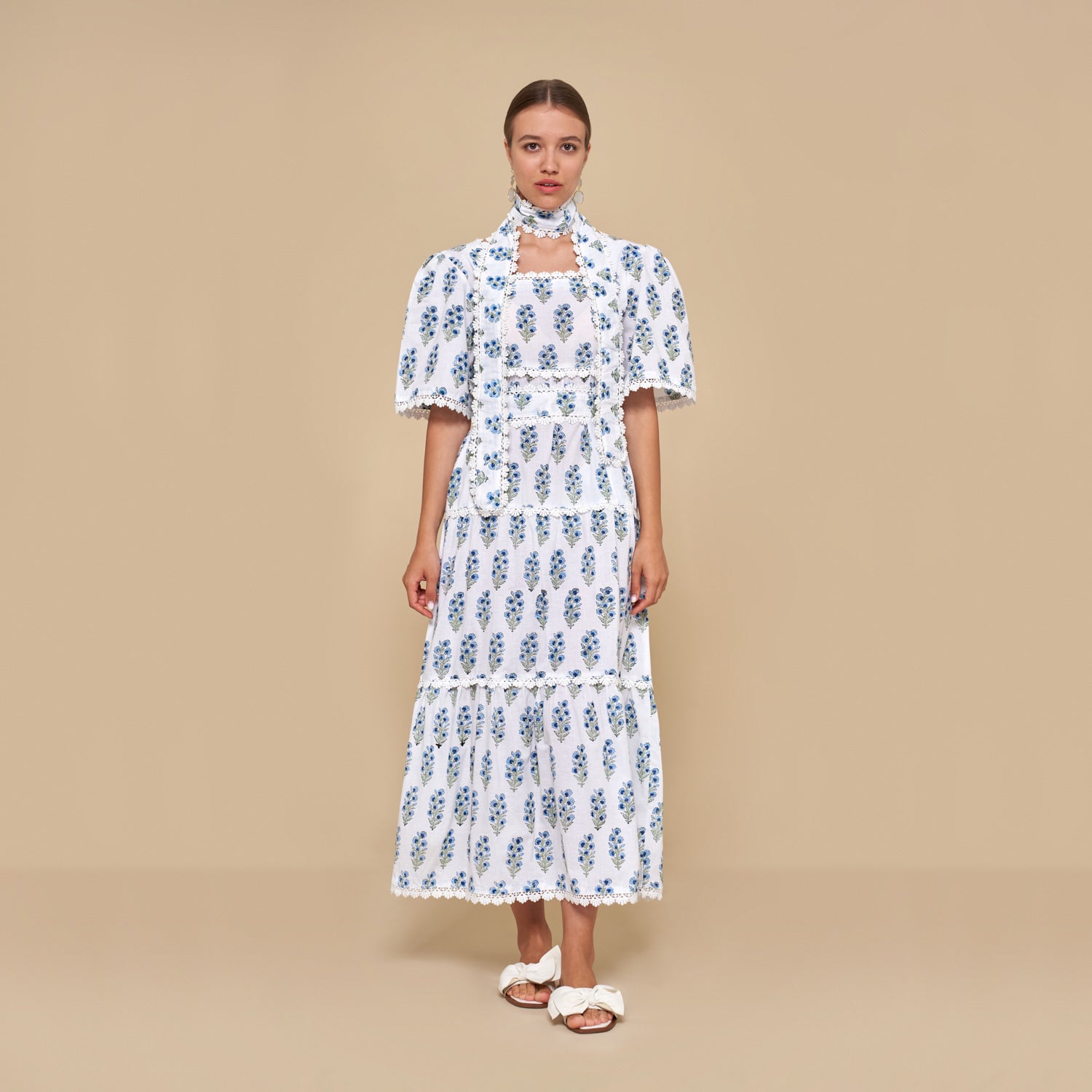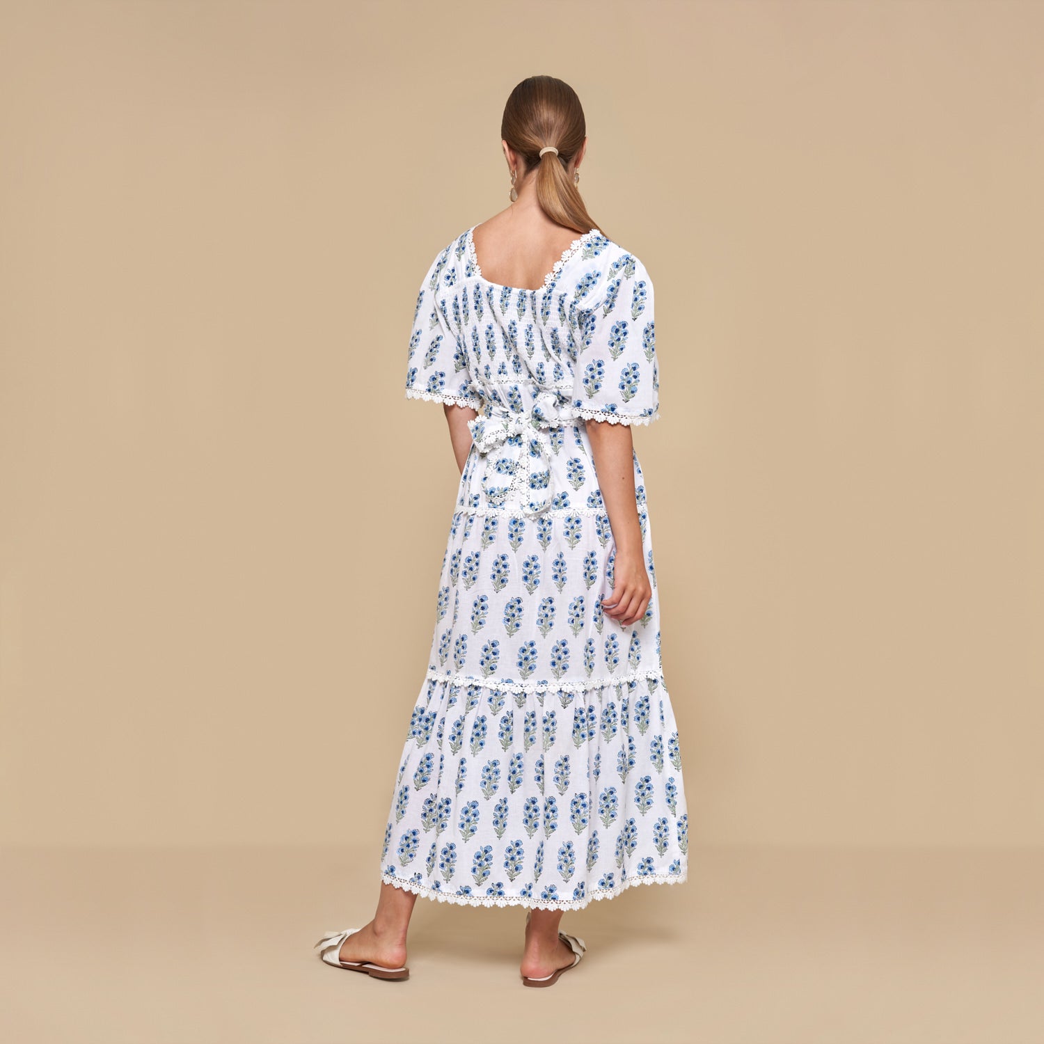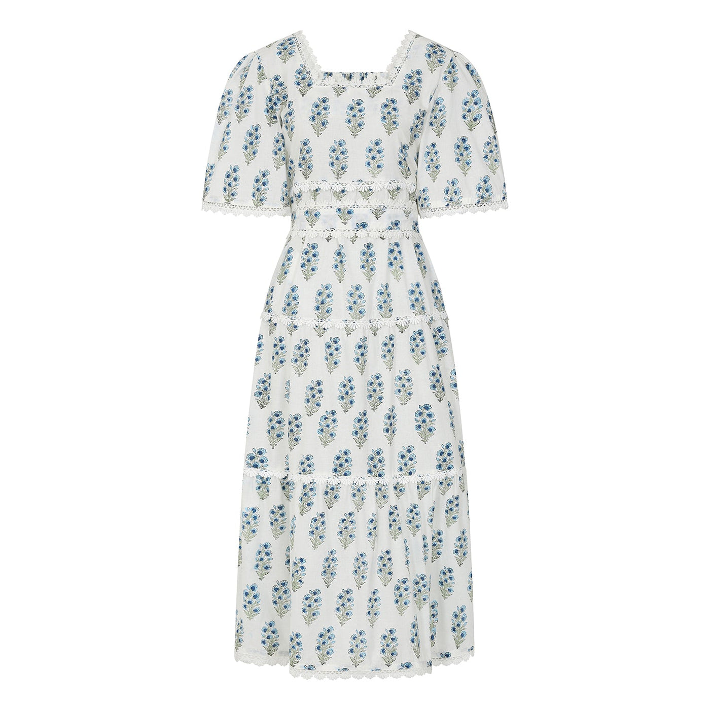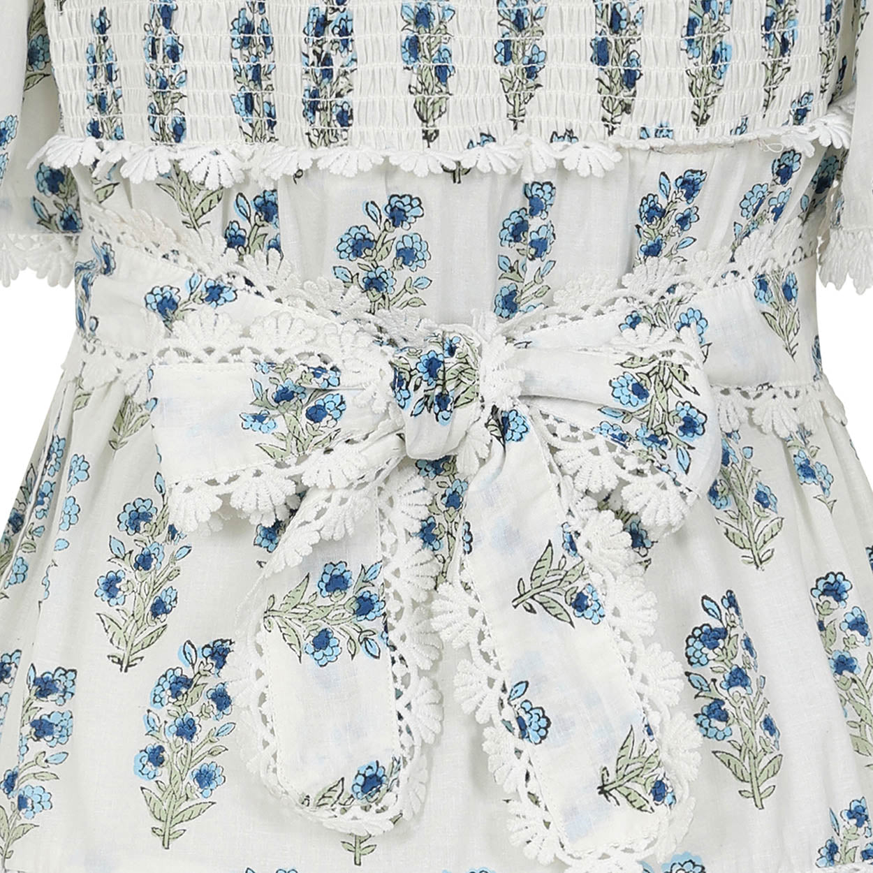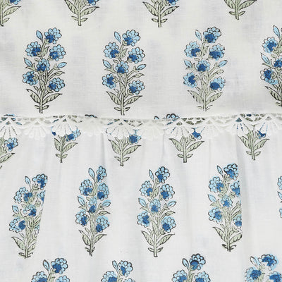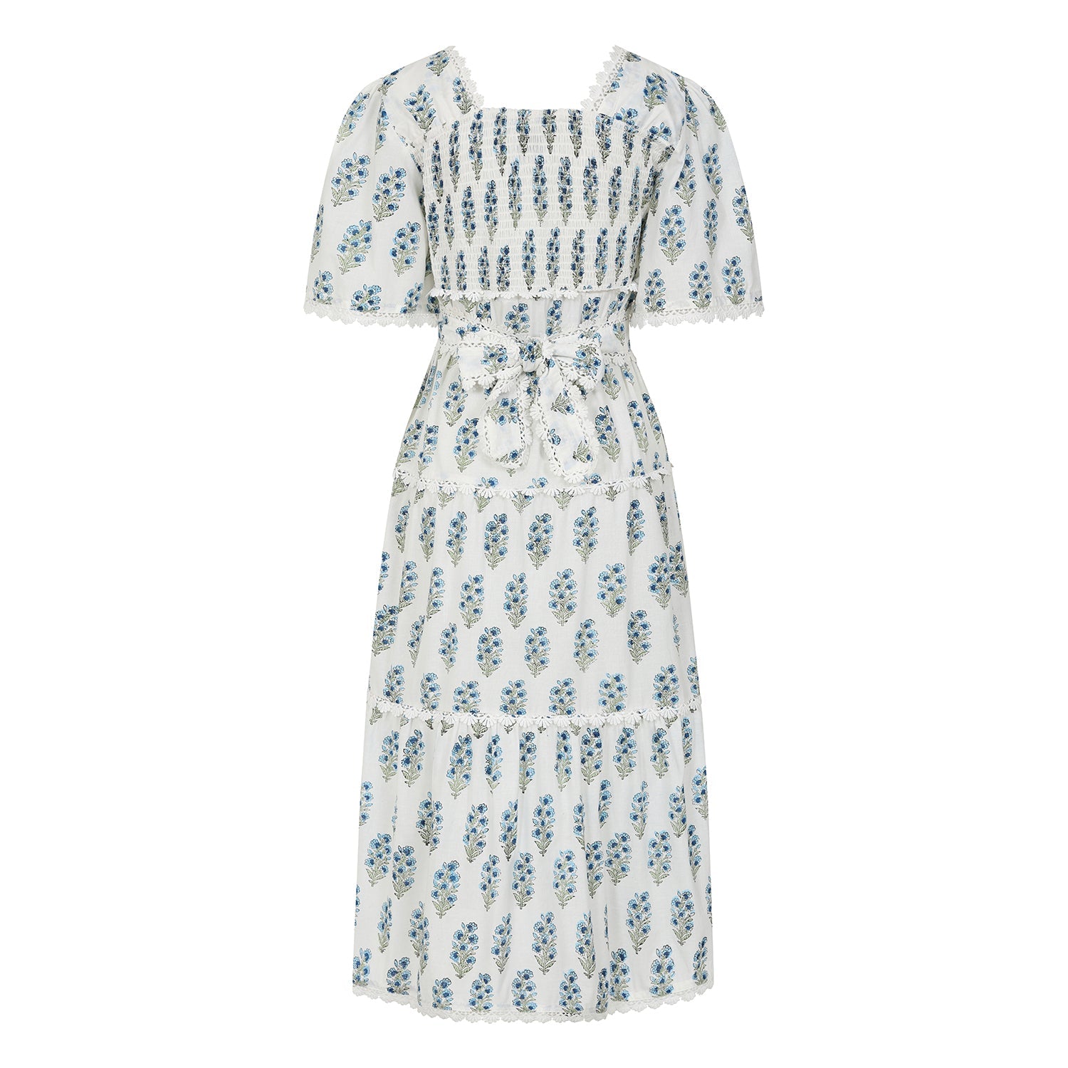 Delicate scalloped lace intricately adorn the fabric. The square neckline, adorned with intricate lace detailing, exudes sophistication, while the shirred back bodice guarantees both a snug fit and exceptional comfort.