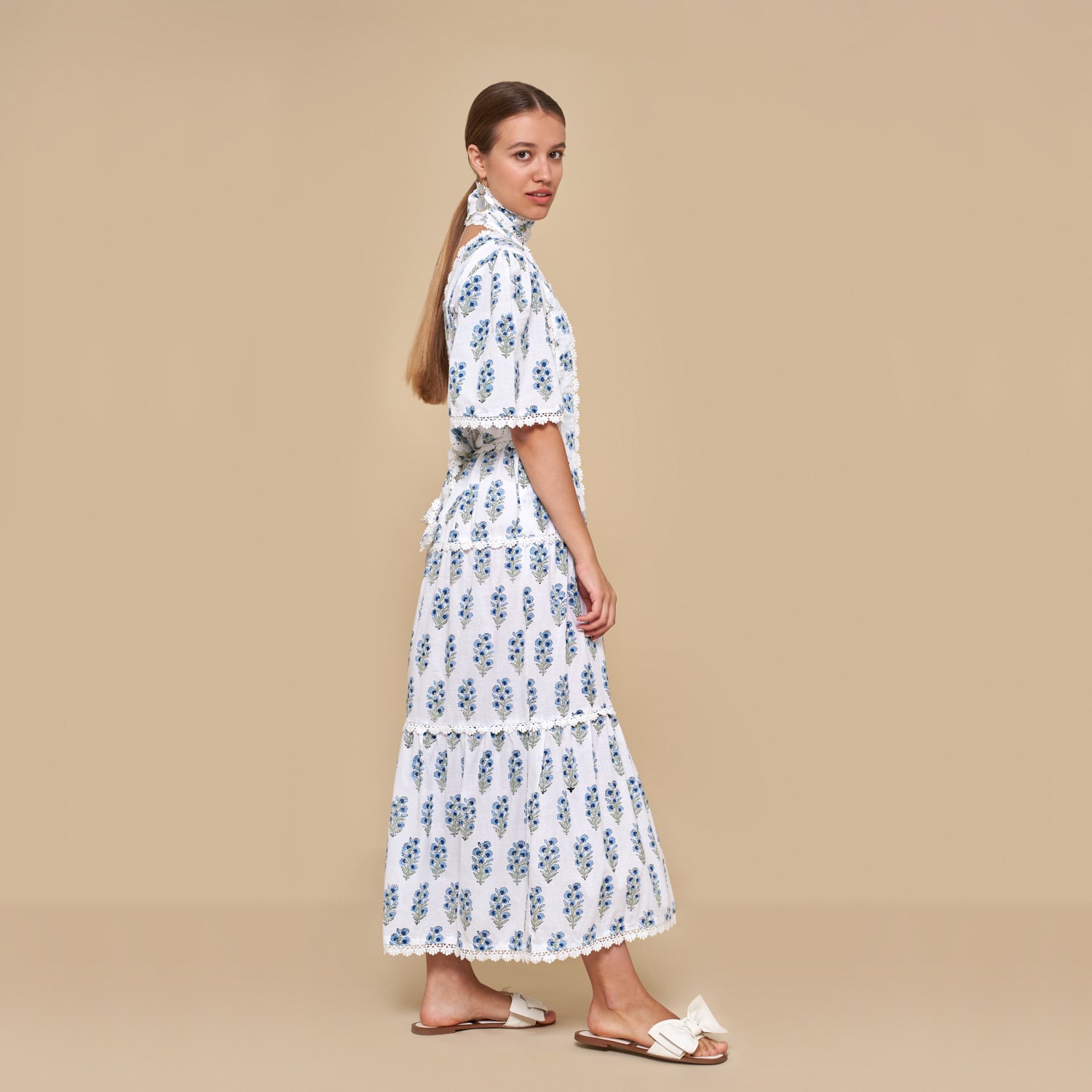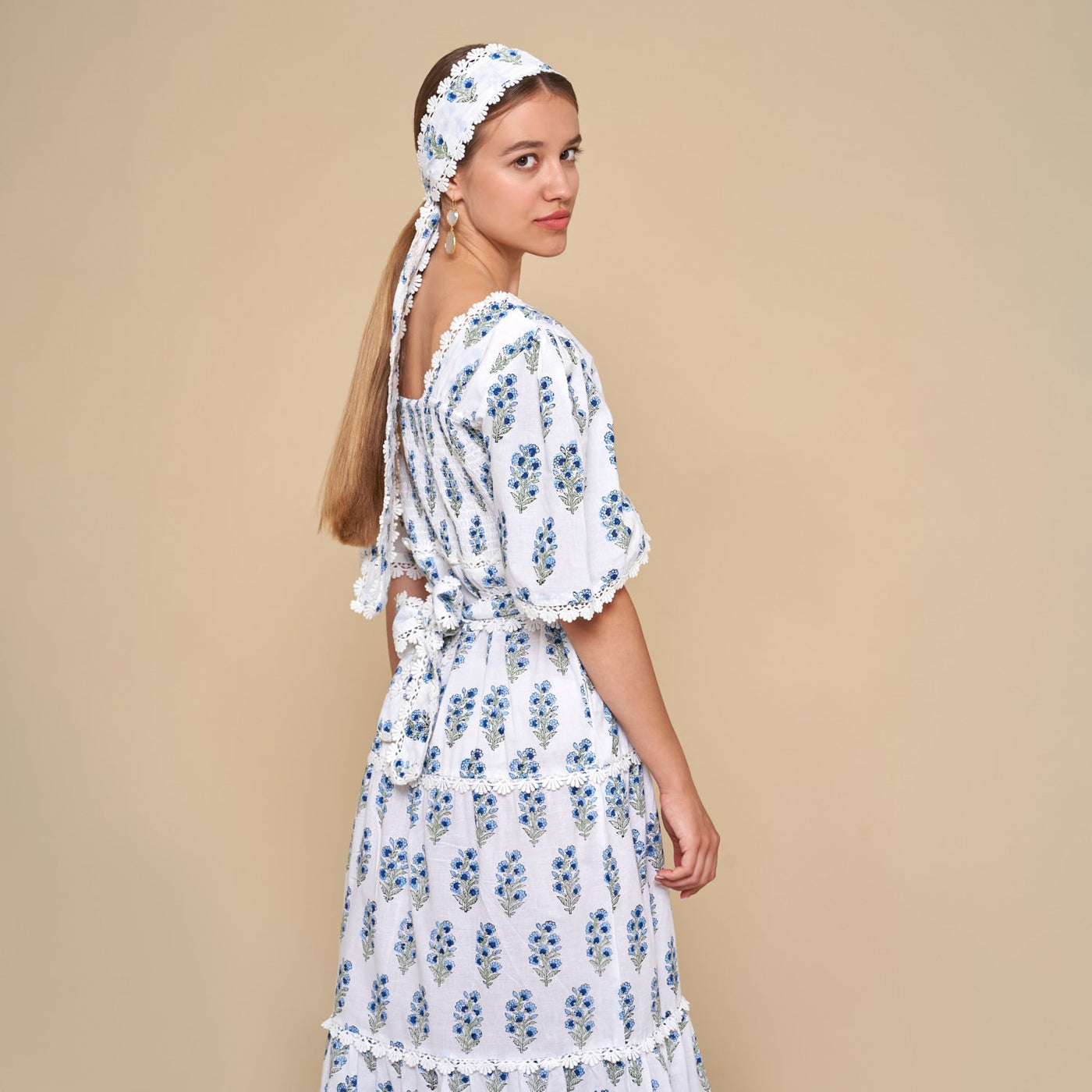 Completing the ensemble are two included optional accessories — which can be worn as a belt, a headband or a scarf. A perfect blue wedding guest dress!