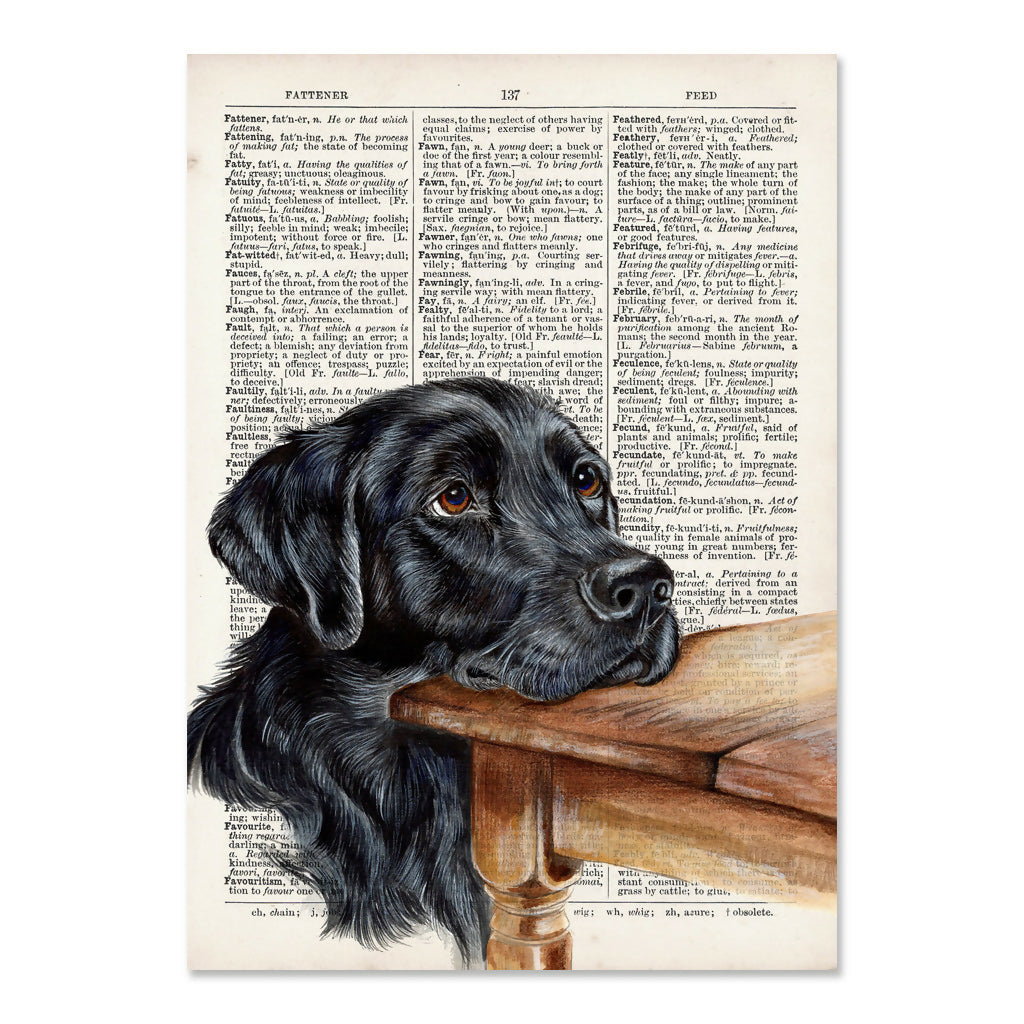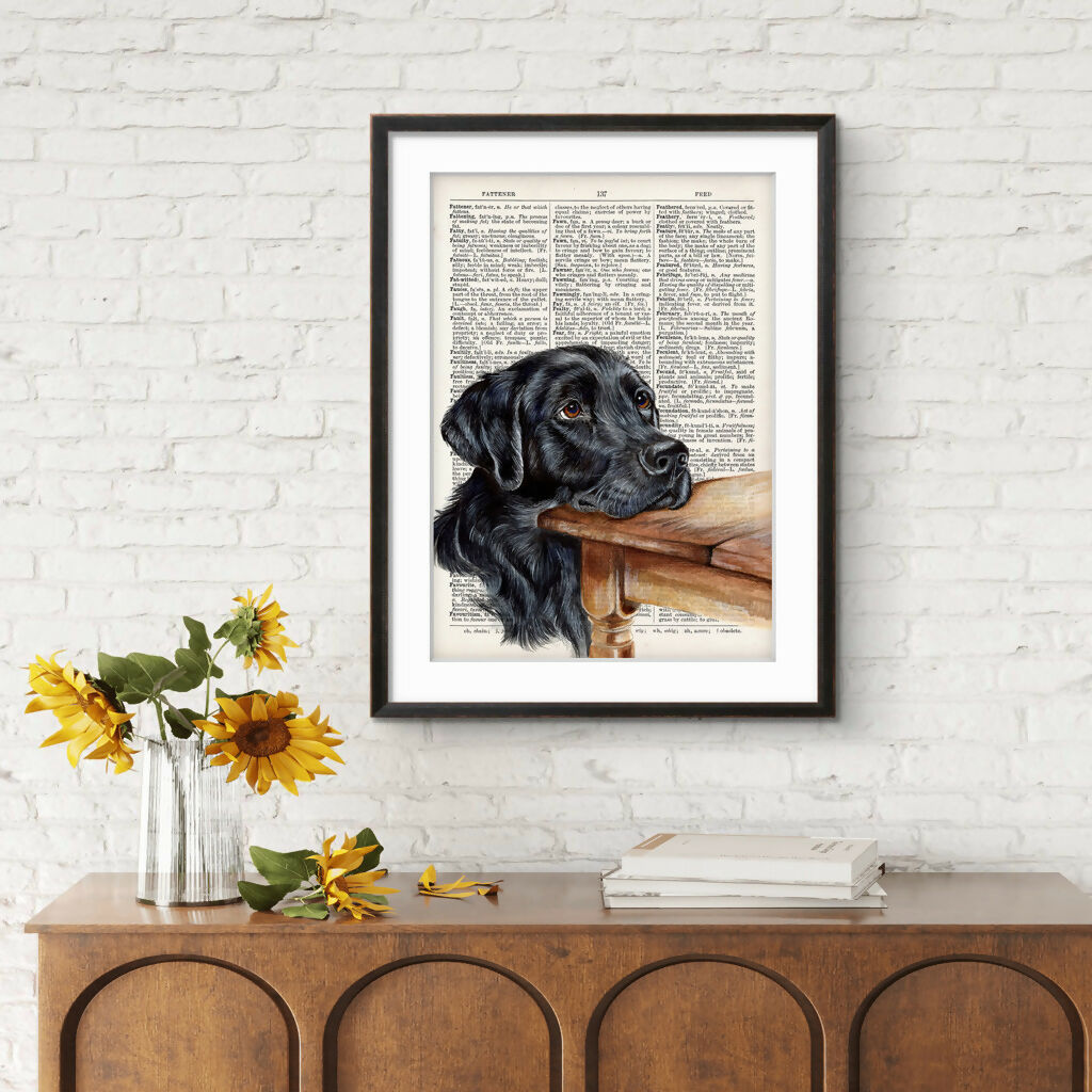 Bring timeless countryside charm into your home with this beautifully detailed black Labrador art print. Featuring a soulful Labrador resting gently on a rustic wooden table, this characterful illustration is printed onto a vintage-style dictionary background for a truly classic feel.