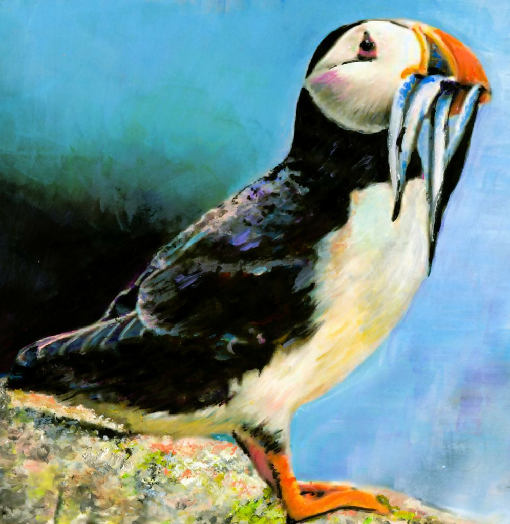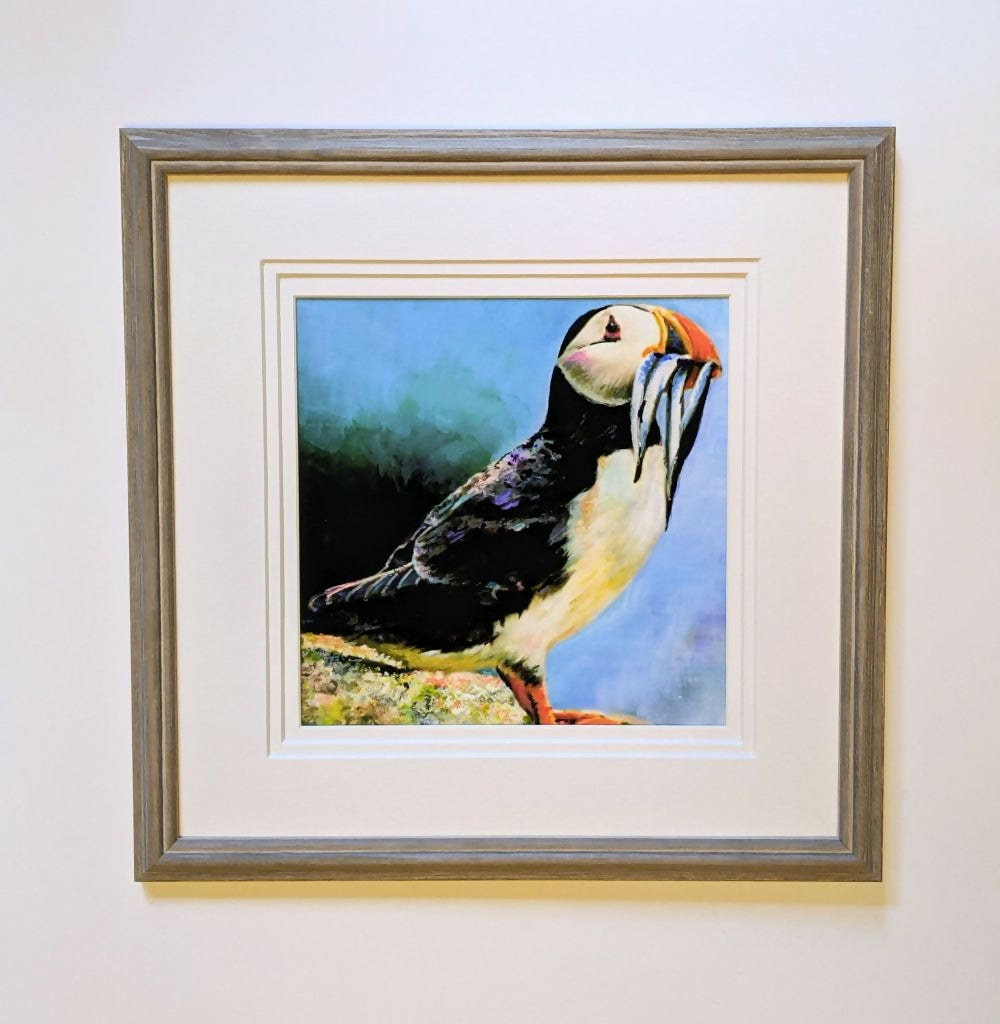 A beautiful painting of a Puffin bringing home it's food . Such a colourful bird with it's wonderful coloured plumage. The painting is treble mounted titled, signed and framed behind glass. Size of framed painting 34 cm x 34 cm (13.5 inches x 13.5 inches)
