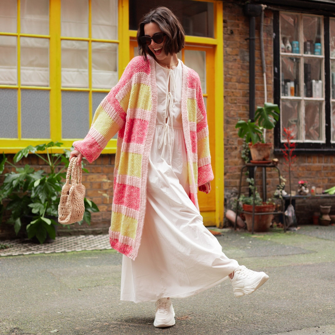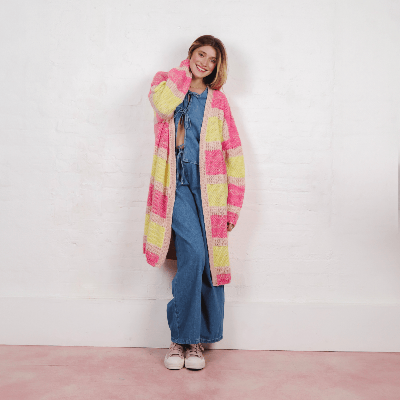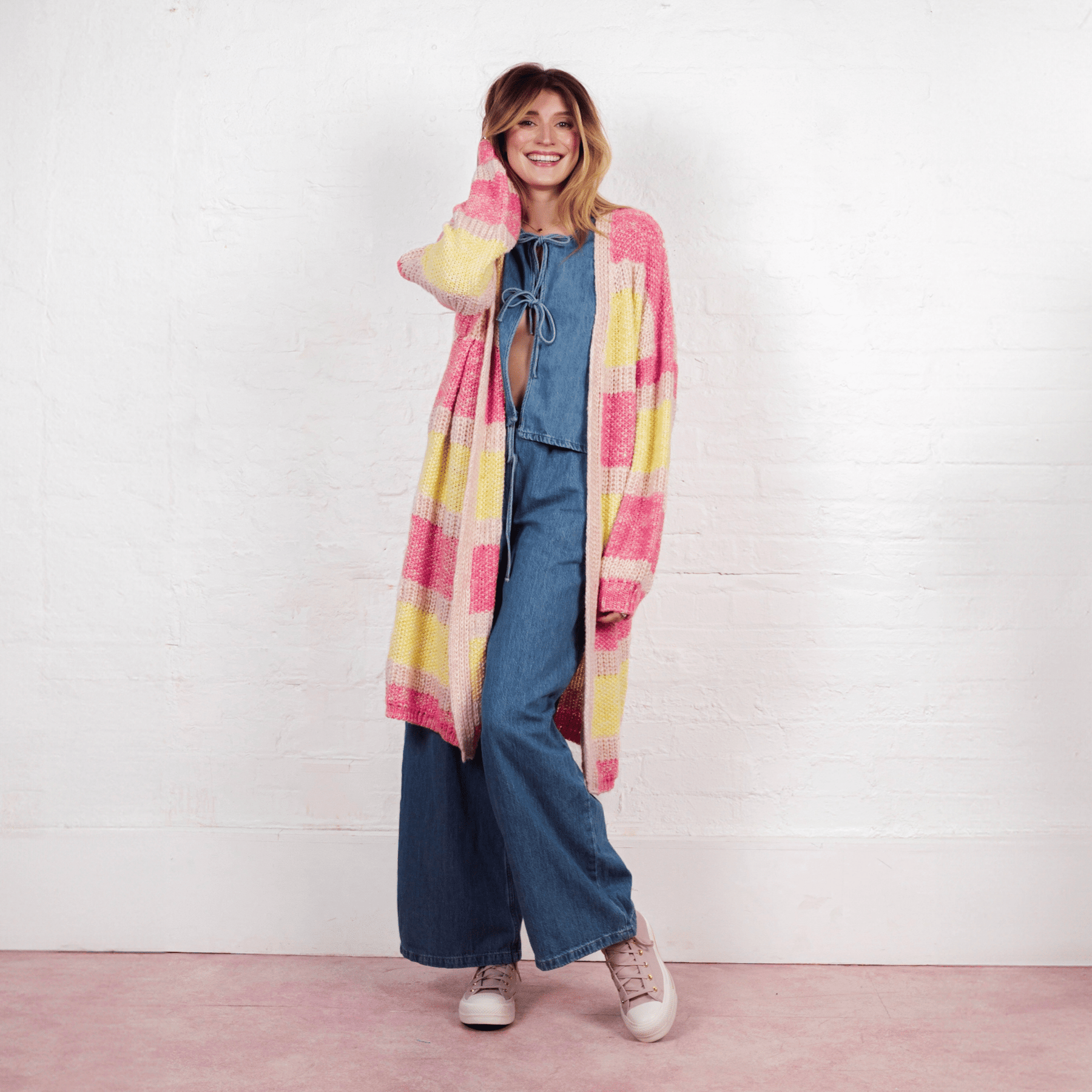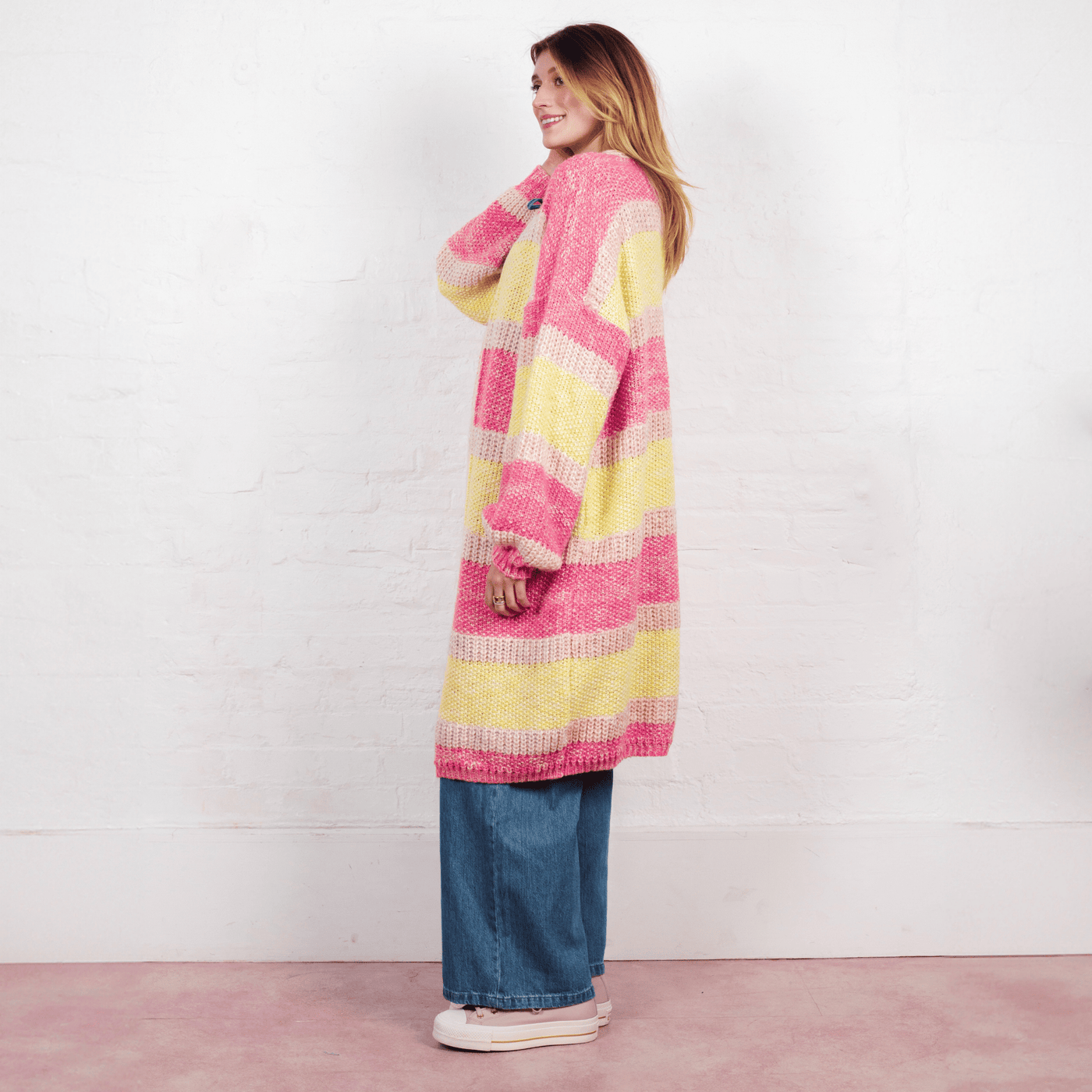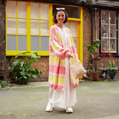Oversized, Striped, Balloon sleeves, what more could you want from summer cardigan? In a lightweight recycled cotten blend yarn this has pops of pink & yellow which layer perfectly over any outfit. In the relaxed oversized cardigan shape this is the perfect style for a beach coverup or to layer over your summer maxi dresses.