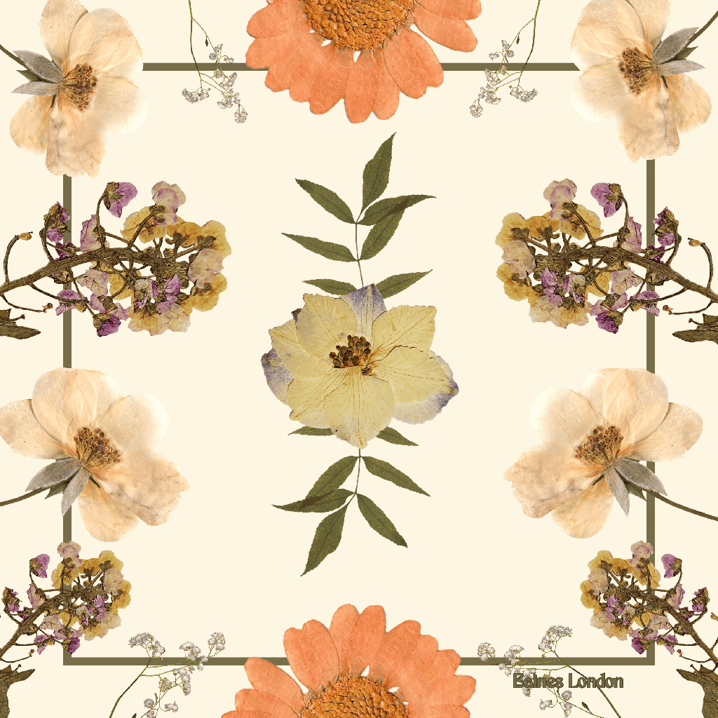 printed to a high quality in the UK. Cream and orange nature design features real images of pressed flowers in the design. Silk is a natural fabric which is hypoallergenic and gentle on skin and hair as well as being biodegradable.