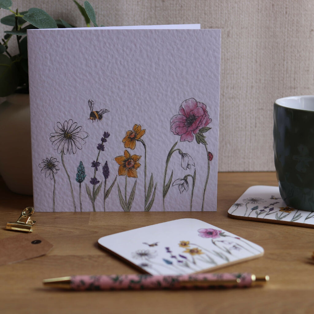 Featuring a watercolour illustration of colourful spring flowers. Why not create the perfect gift and pair it with a matching keyring or coaster.