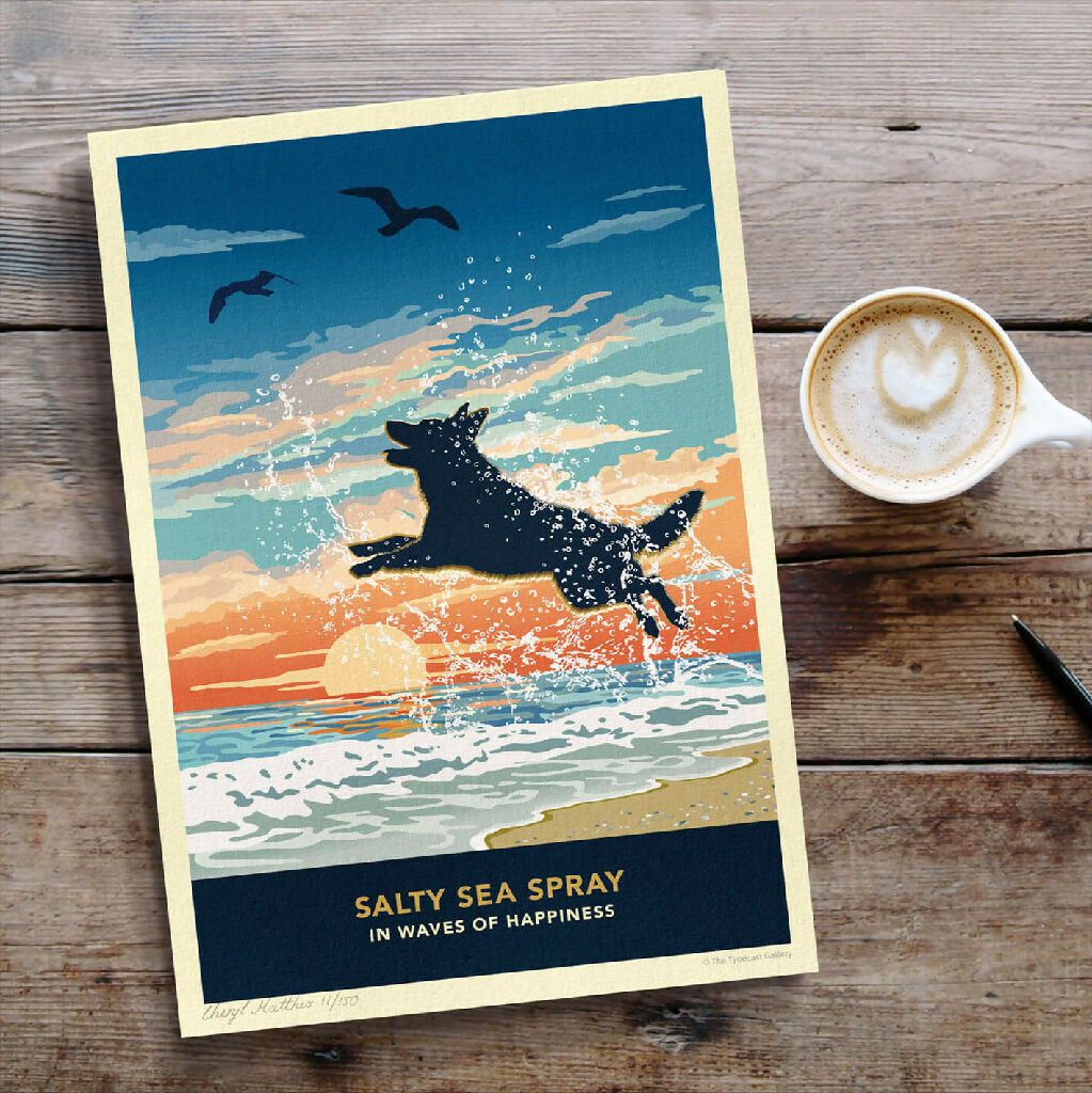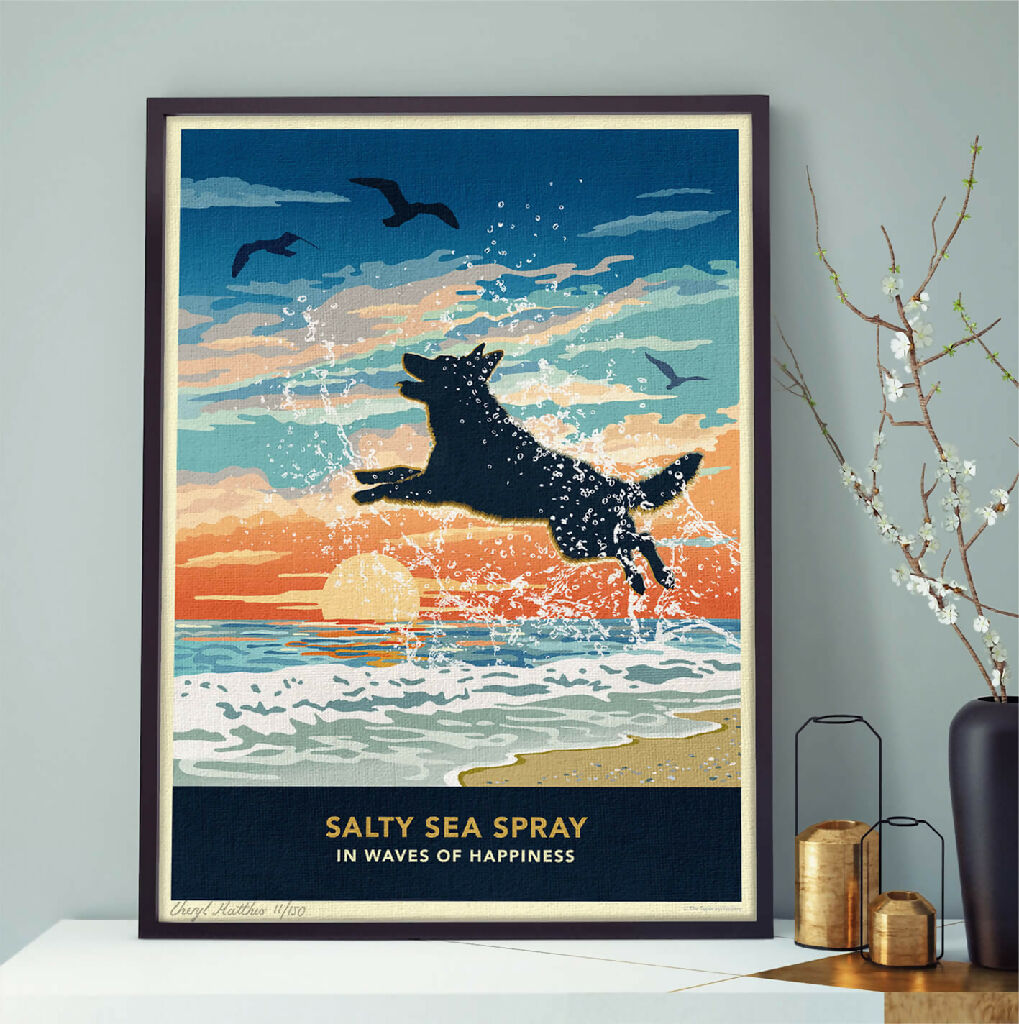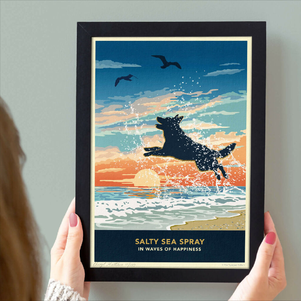 Celebrate the refreshing thrill of the seaside with this beautiful german shepherd silhouette print. Each print is signed and numbered as part of limited-edition print runs.