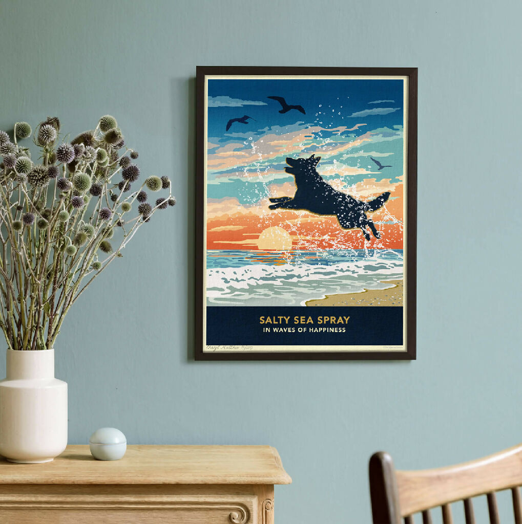Illustrated in a radiant and bold vintage style, this striking german shepherd art print draws inspiration from classic travel posters of the early twentieth century. This original artwork makes a thoughtful and stylish gift for any alsatian owner, perfect for adding warmth and character to a home, beach house, or gallery wall.