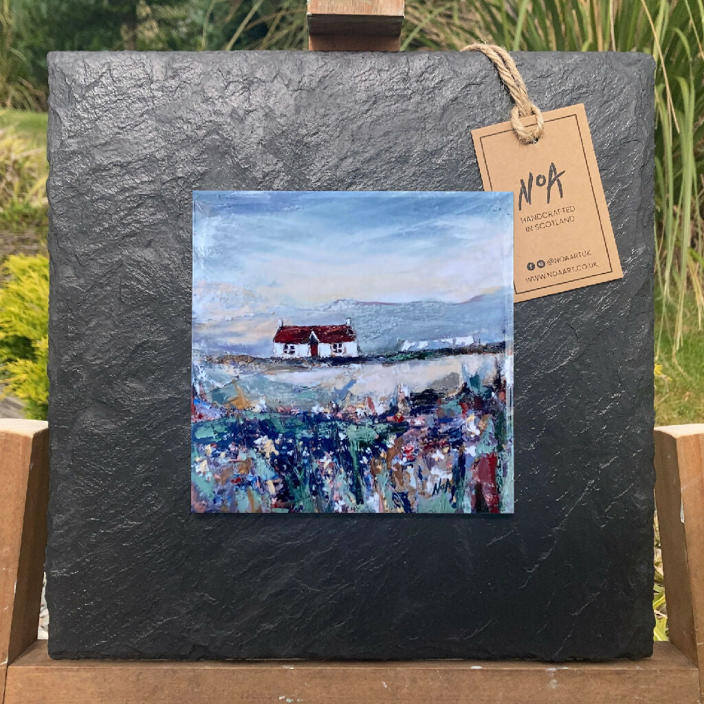 "Whinny Brae" is a glossy ceramic tile print of an original "Noa" painting, mounted onto natural slate. Each slate is meticulously hand-crafted by Noa's son before he applies a natural oil finish to bring out their unique grain. Living at the foot of some of Scotland’s most beautiful glens and a short distance from the North Sea, Noa is inspired by capturing the spirit of Scotland.