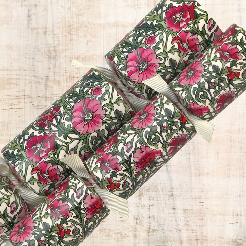 Our William Morris Pink Florals design cracker making craft kit is exclusive to us and will give your celebrations an unique touch.