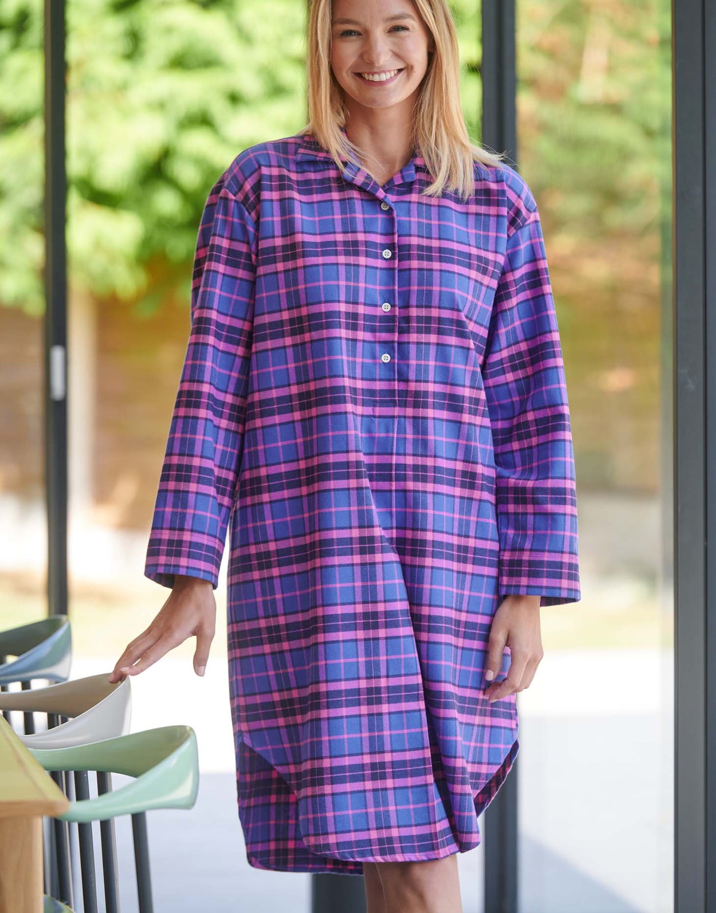 So chic are our women's nightshirts, you’ll actually want to wear them outside the house.* This style is created from beautiful brushed cotton for year-round comfort. The fibres in the cloth are dyed to our own colour specification, then brushed repeatedly to make them super soft, and finally woven with skill to our in-house design. A four-button neck opening completes this nightshirt.